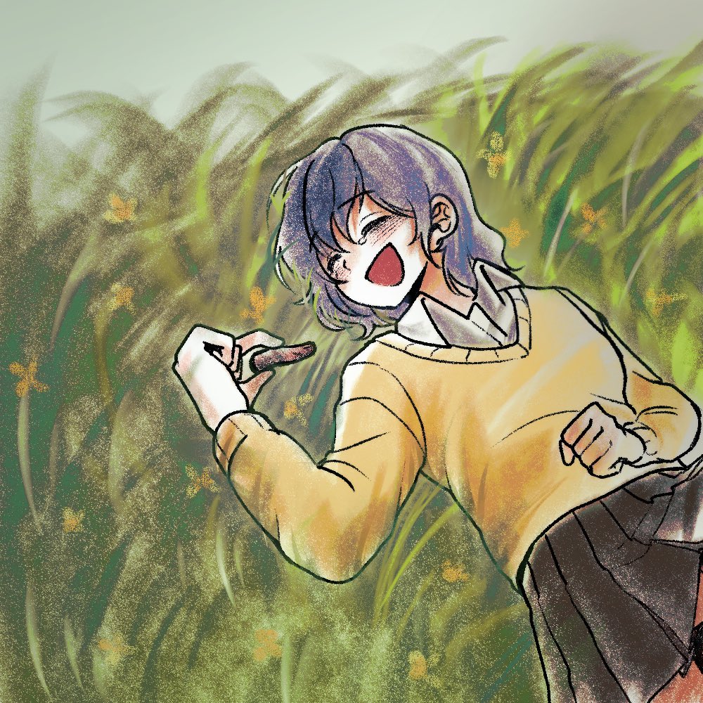 1girl black_skirt blue_hair breasts collared_shirt commentary dark_blue_hair day grass hand_on_own_stomach korean_commentary long_sleeves lying medium_hair miniskirt nand9ng on_back on_ground open_mouth outdoors pleated_skirt saibou_shinkyoku shirt skirt small_breasts smile solo sweater tearing_up white_shirt yanagi_nina yellow_sweater