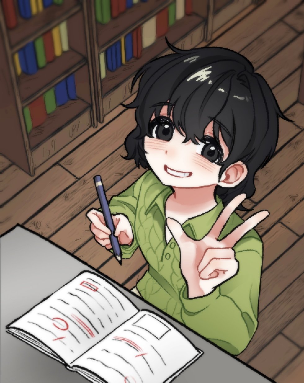 1girl black_eyes black_hair book bookshelf cable_knit collared_shirt commentary_request desk from_above grading green_shirt grin hair_between_eyes highres holding holding_pencil indoors korean_commentary long_sleeves looking_at_viewer medium_hair nand9ng open_book pencil saibou_shinkyoku shirt short_hair sitting smile solo w wooden_floor yanagi_nina