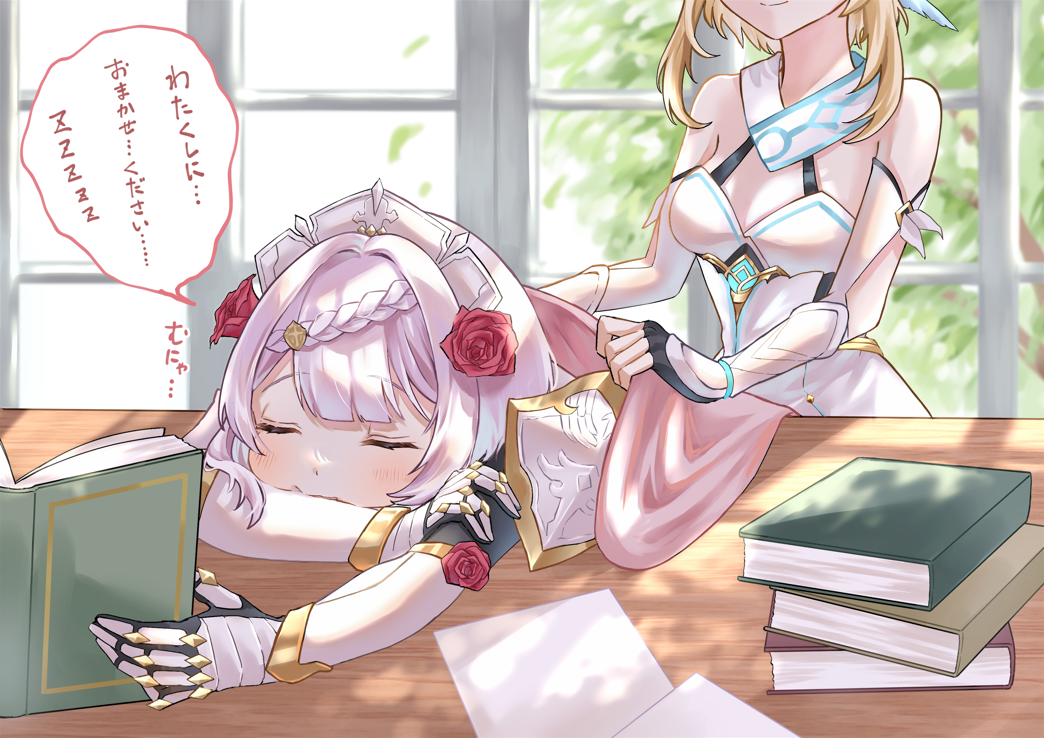 2girls absurdres armor bare_shoulders blanket blonde_hair blunt_bangs book braid braided_bangs closed_eyes closed_mouth commentary_request dress flower gauntlets genshin_impact hair_flower hair_ornament highres indoors lumine_(genshin_impact) maid_headdress multiple_girls noelle_(genshin_impact) open_book paper red_flower red_rose rose shoulder_armor sleeping speech_bubble spoken_zzz table translated tsuchinoko_(tuchituchi11) upper_body white_dress white_hair zzz