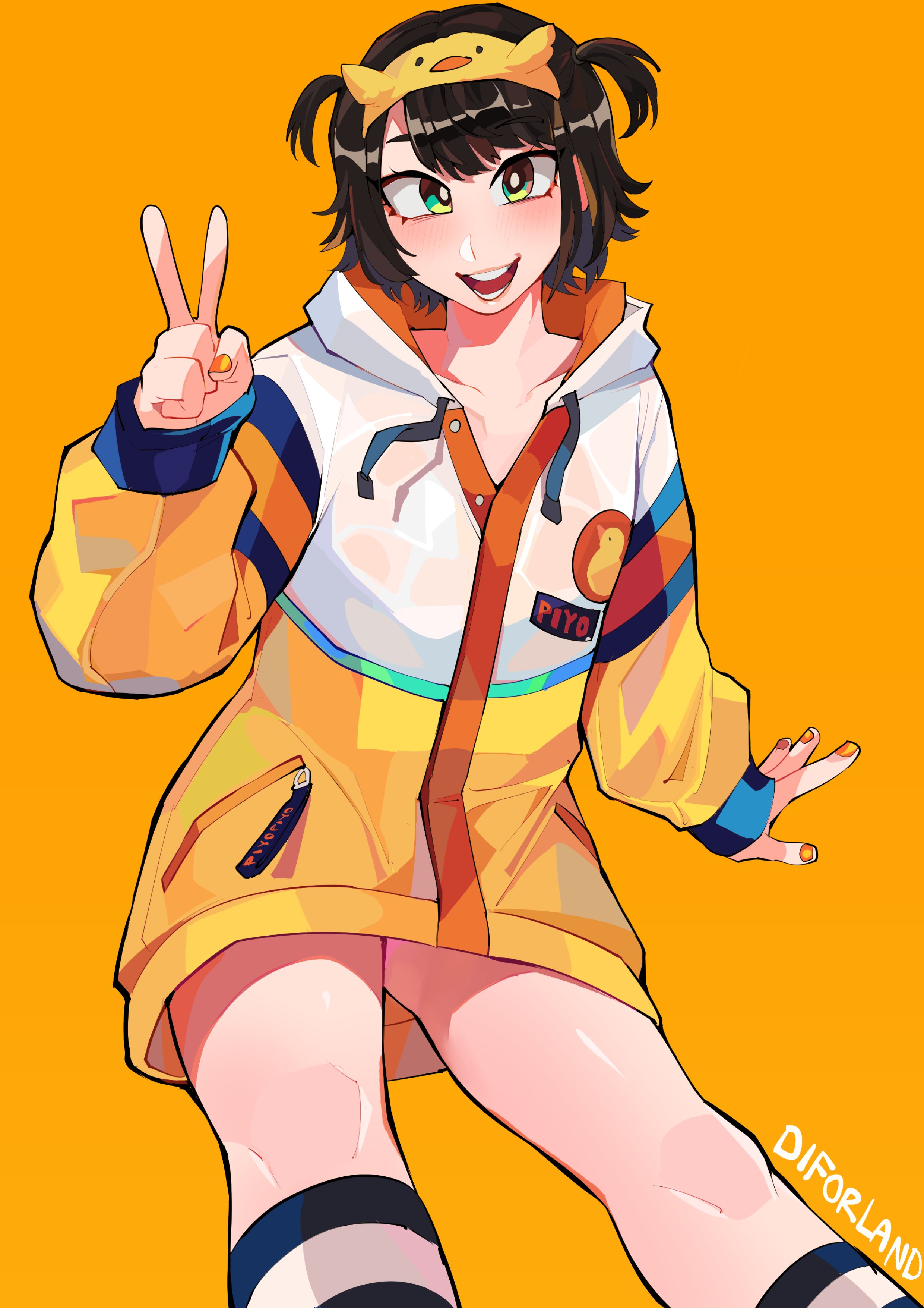 1girl absurdres artist_name black_socks bright_pupils brown_hair diforland duck_hair_ornament green_eyes highres hololive hood hooded_jacket jacket multicolored_jacket nail_polish official_alternate_costume oozora_subaru oozora_subaru_(loungewear) open_mouth orange_background orange_nails short_twintails simple_background socks solo striped_clothes striped_socks teeth twintails two-tone_socks v virtual_youtuber white_jacket white_pupils white_socks yellow_jacket