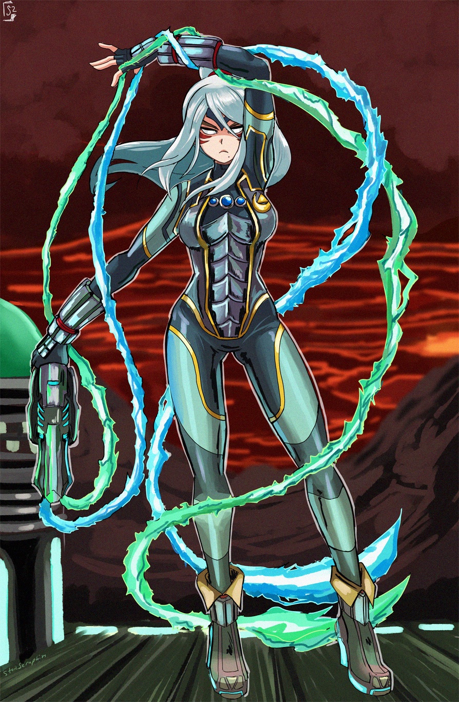 1girl alternate_color alternate_costume alternate_eye_color alternate_hair_color alternate_weapon armor blue_gem bodysuit boots breastplate breasts chest_jewel commentary corruption crescent crescent_print crossover dark_persona double_helix energy_whip english_commentary facial_mark facial_tattoo fierce_deity fingerless_gloves frown gem gloves glowing high_heel_boots high_heels highres holding holding_weapon holding_whip lava long_hair looking_down metroid metroid:_zero_mission nintendo no_pupils outstretched_arms ponytail possessed possession samus_aran serious skin_tight standing stoic_seraphim super_smash_bros. tattoo the_legend_of_zelda the_legend_of_zelda:_majora's_mask triangle triangle_print weapon whip white_eyes white_hair wrist_guards zero_suit