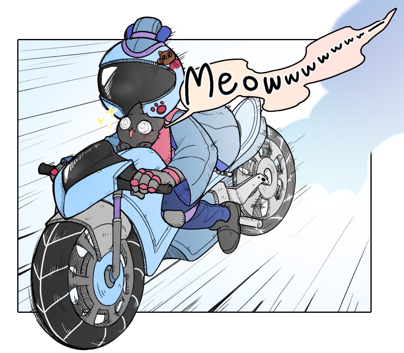 1other animalization blue_jacket blue_pants cat character_request helmet jacket knee_pads mechanical_arms motorcycle_helmet nine_sols open_mouth pants shanhai_9000 sitting smile solo speech_bubble white_eyes yyang_gg