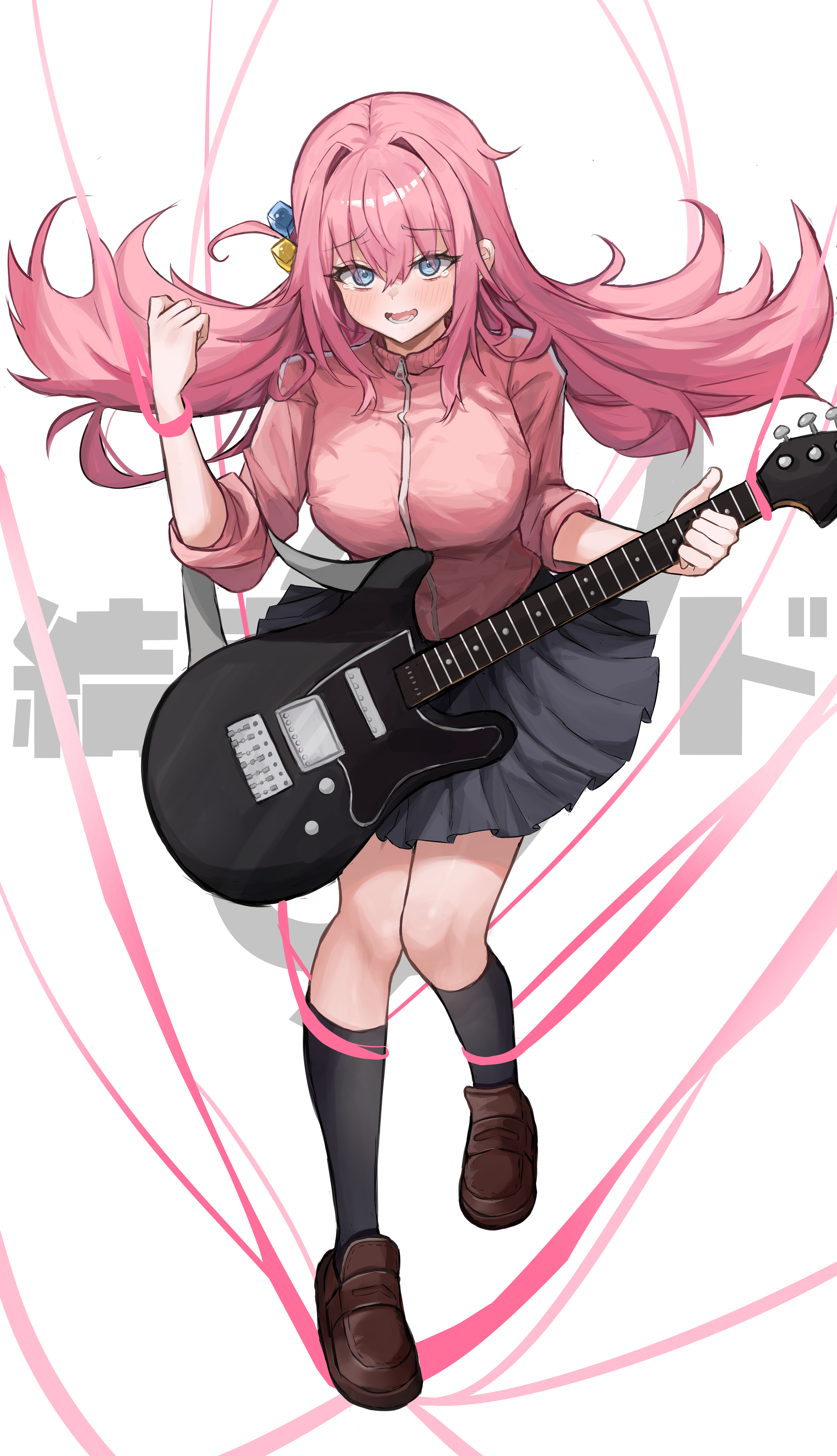 1girl absurdres blue_eyes blush bocchi_the_rock! brown_footwear cube_hair_ornament electric_guitar full_body gibson_les_paul gotoh_hitori guitar hair_ornament highres hoangryu holding holding_instrument instrument jacket long_hair long_sleeves looking_at_viewer one_side_up open_mouth pink_hair pink_jacket pink_track_suit side_ahoge simple_background skirt smile solo track_jacket track_suit