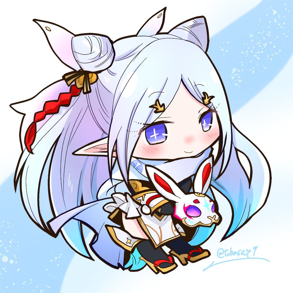 black_socks blue_background blue_eyes blue_hair chibi closed_mouth commentary cone_hair_bun hair_bun hair_ornament high_heels long_hair mask monoyoshi_sadamune_(tenka_hyakken) official_alternate_costume pointy_ears rabbit_mask scarf smile socks tenka_hyakken tubasa49 twitter_username veil white_scarf white_veil