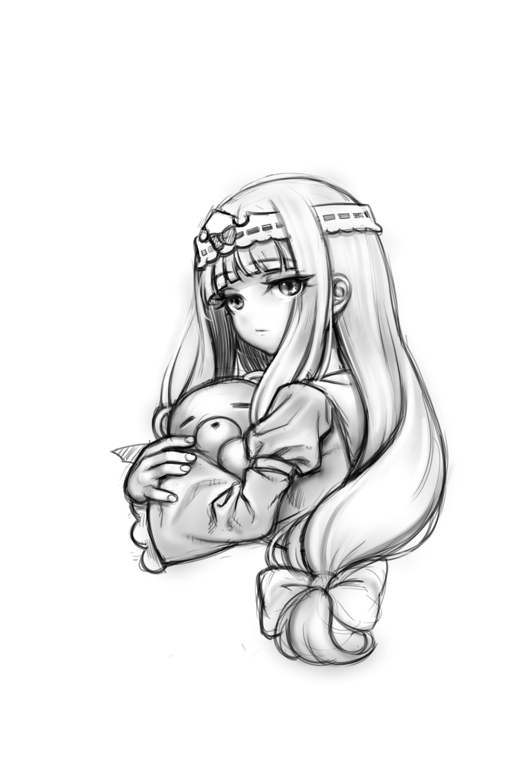 1girl aurora_sya_lis_kaymin bad_id bad_pixiv_id cropped_torso expressionless greyscale headband henkyou_(e-f-frontier.net) highres long_hair looking_at_viewer maou-jou_de_oyasumi monochrome simple_background sketch solo stuffed_animal stuffed_toy teddy_bear upper_body
