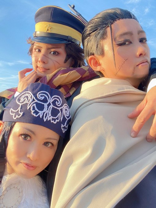 3girls black_hair chouzuki_maryou crossdressing crossdressing_(ftm) east_asian golden_kamuy makeup multiple_girls photo_(medium) plump