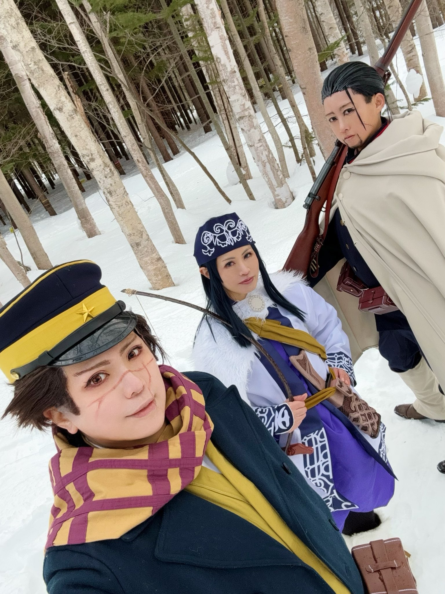 3girls black_hair chouzuki_maryou crossdressing crossdressing_(ftm) east_asian golden_kamuy highres makeup multiple_girls photo_(medium) plump
