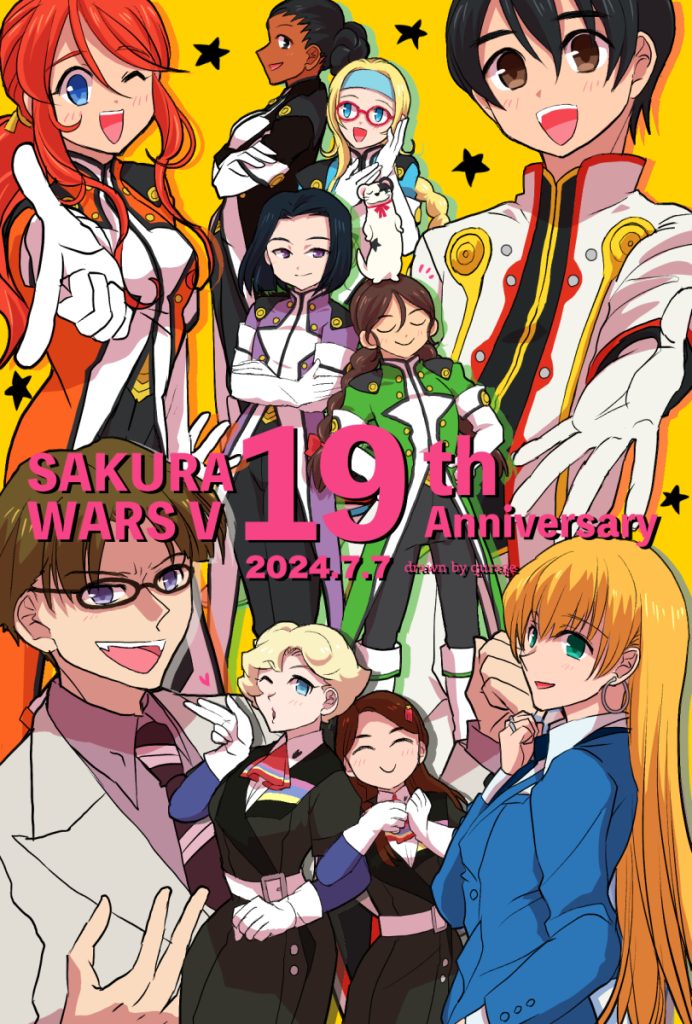 2boys 6+girls black_hair blonde_hair blowing_kiss blue_eyes blue_hair braid breasts brown_eyes brown_hair closed_eyes crossed_arms dark-skinned_female dark_skin diana_caprice evil_smile from_side gemini_sunrise glasses gloves green_eyes hair_bun hairband hands_on_own_hips index_finger_raised large_breasts legs long_hair medium_breasts multiple_boys multiple_girls necktie office_lady one_eye_closed open_mouth outstretched_arm pants purple_eyes ratchet_altair red_hair rikaritta_aries sagitta_weinberg sakura_taisen sega short_hair small_breasts smile taiga_shinjirou thighs twin_braids wink