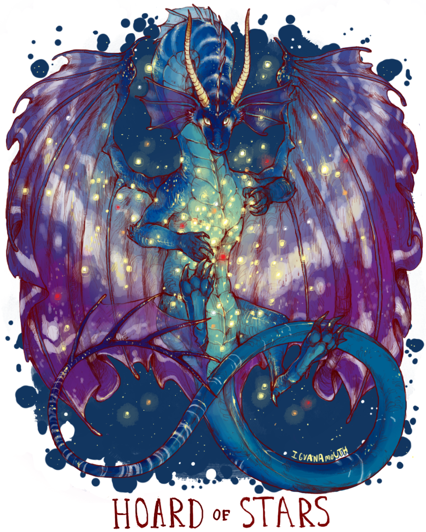 artist_name blue_background blue_scales border claws commission dragon fantasy floating full_body glowing horns iguanamouth looking_at_viewer monster night no_humans original purple_wings sky space spines star_(sky) starry_sky white_border wings yellow_eyes yellow_horns yellow_light