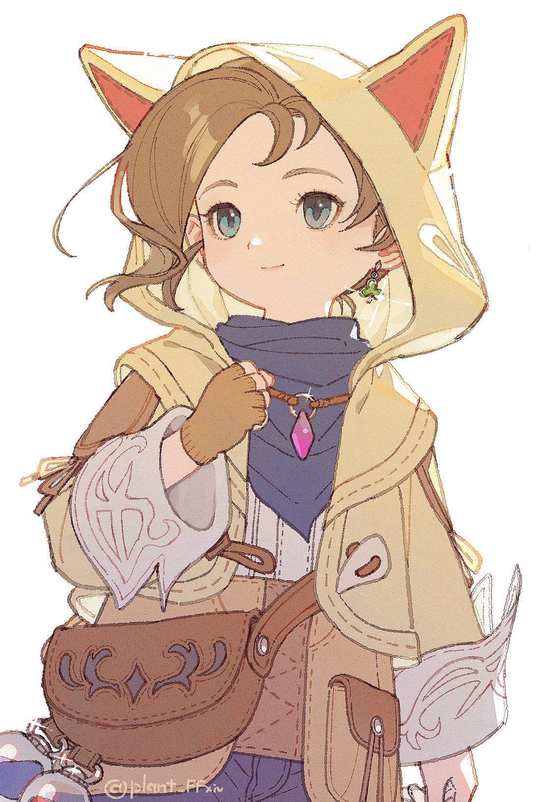 1girl animal_hood blue_eyes blue_scarf brown_gloves brown_hair cat_hood cowboy_shot doranatsu_(plant_ffxiv) earrings fanny_pack final_fantasy final_fantasy_xiv fingerless_gloves gloves highres hood hood_up hooded_jacket jacket jewelry krile_baldesion_(ff14) lalafell o-ring pointy_ears pouch scarf short_hair signature simple_background single_earring single_fingerless_glove smile solo standing twitter_username white_background yellow_jacket