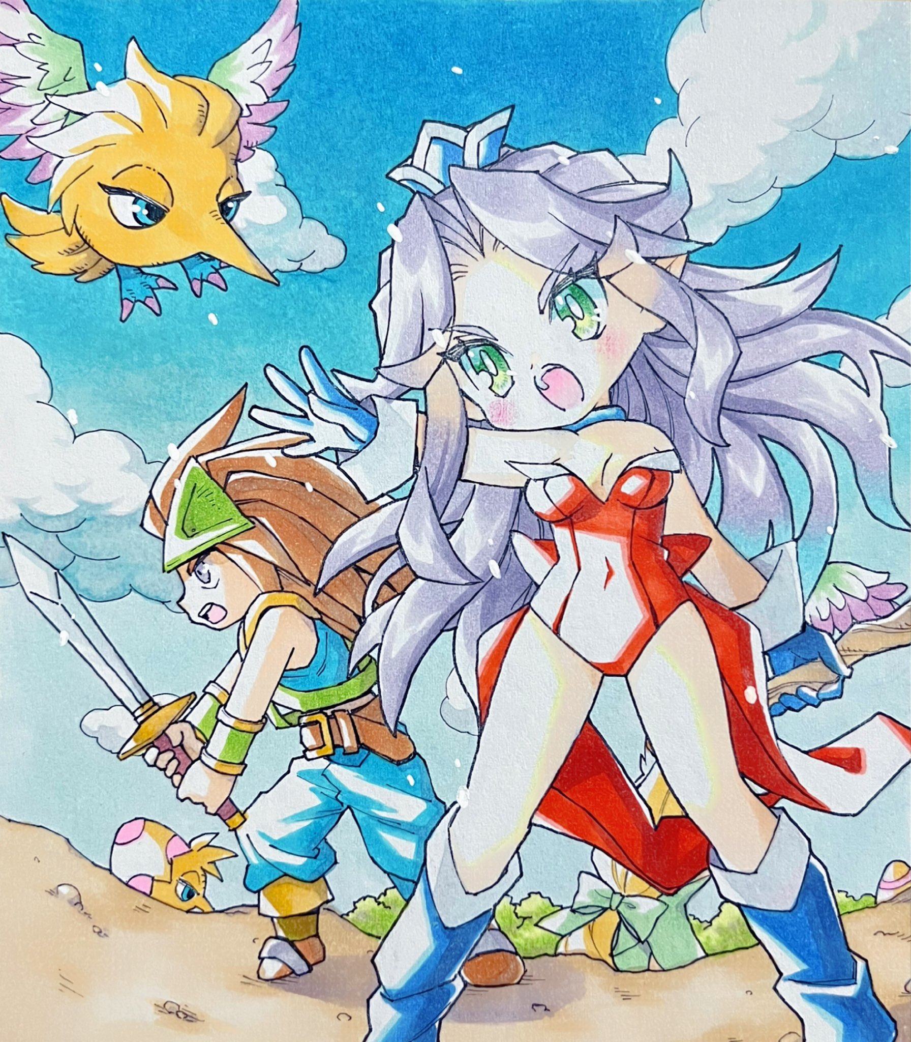 1boy 2girls angela_(seiken_densetsu_3) bare_shoulders battle belt blonde_hair blue_eyes blue_footwear blue_gloves blue_hat blue_pants blue_shirt boots bow bracer breasts brown_belt brown_hair cleavage cloud cloudy_sky covered_navel creature duran_(seiken_densetsu_3) fighting_stance full_body furrowed_brow gloves green_bow green_eyes hair_bow hat helmet highres holding holding_staff holding_sword holding_weapon leotard long_hair medium_breasts motoko_(taom) multiple_girls open_mouth outstretched_hand pants parted_bangs pointy_ears red_leotard riesz seiken_densetsu seiken_densetsu_3 shirt sidelocks sky staff strapless strapless_leotard sword traditional_media wavy_hair weapon winged_helmet