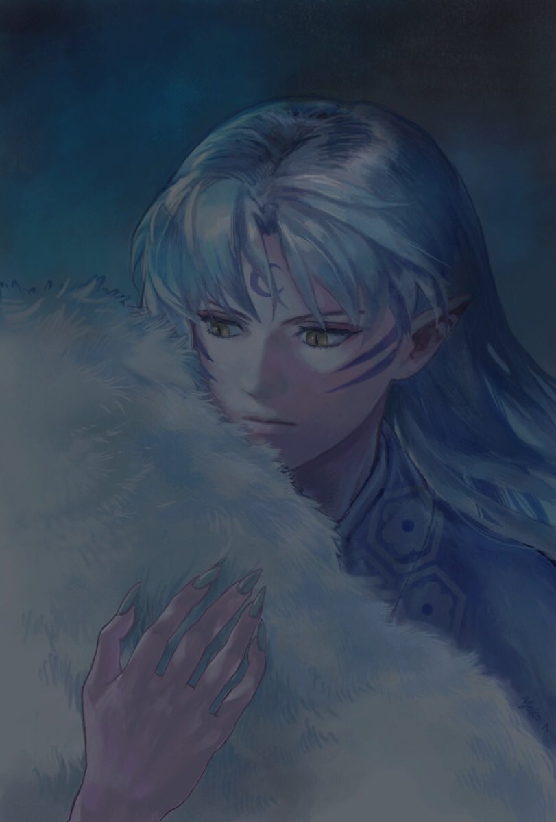1boy closed_mouth crescent crescent_facial_mark curtained_hair facial_mark fingernails forehead_mark fur_shawl highres inuyasha long_hair male_focus niko_(silent.whitesnow) pointy_ears sesshoumaru sharp_fingernails shawl solo upper_body white_hair