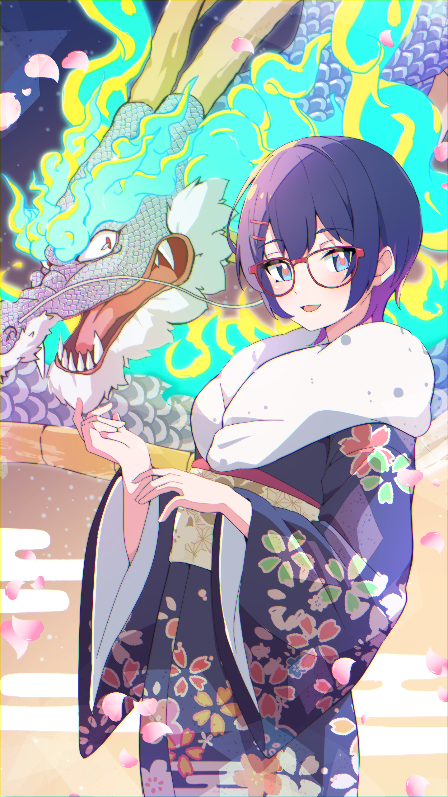 1girl :d absurdres amamiya_maki_(miyama_(yakinikusushi_the_royal)) black_kimono blue_eyes blue_hair brown_sash chinese_zodiac colored_tips commentary_request dark_blue_hair dragon eastern_dragon egasumi floral_print floral_print_kimono fur-trimmed_kimono fur_trim furisode glasses hair_ornament hairclip hands_up highres japanese_clothes kimono long_sleeves looking_at_viewer medium_hair miyama_(yakinikusushi_the_royal) multicolored_hair obi open_mouth original print_kimono purple_hair red-framed_eyewear red_pupils sakuramon sash smile wide_sleeves year_of_the_dragon
