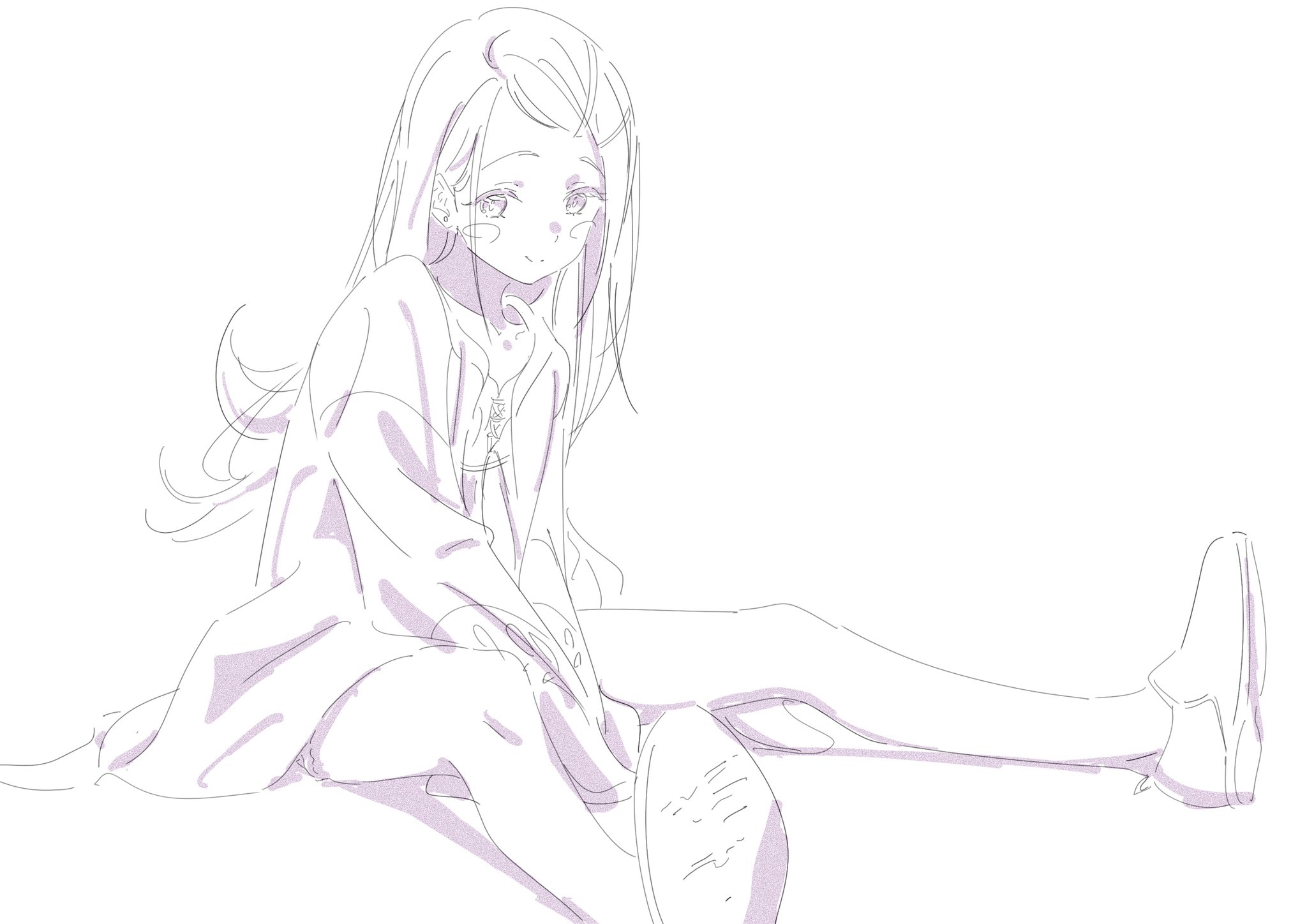 1girl arms_between_legs gakuen_idolmaster hair_ornament hairclip highres idolmaster jacket long_hair long_sleeves no_socks open_clothes open_jacket shinosawa_hiro shoes short_shorts shorts sitting sketch smile solo super-saiya-0173
