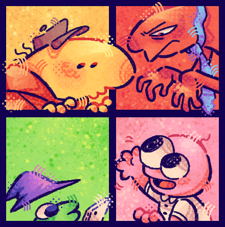 abacatencio allan_(smiling_friends) bald blue_necktie brown_hat cellphone charlie_dompler colored_skin glep_(smiling_friends) green_skin hat hood hoodie looking_down lowres necktie orange_hoodie phone pim_pimling pink_skin purple_hat red_skin smartphone smiling_friends solid_circle_eyes waving wizard_hat yellow_skin