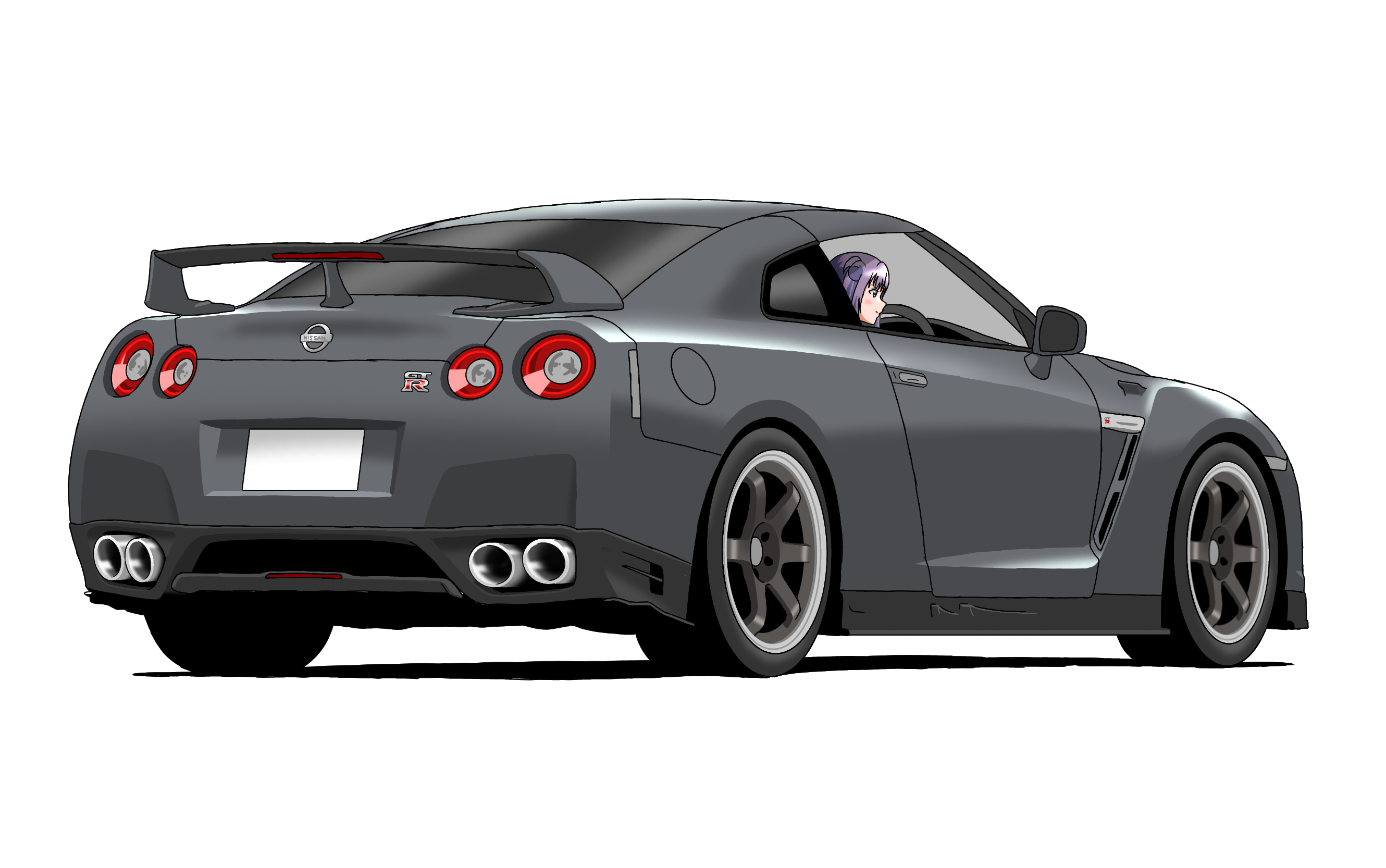 1girl car commentary_request highres link!_like!_love_live! love_live! motor_vehicle nissan nissan_gt-r otomune_kozue purple_hair solo spoiler_(automobile) vehicle_focus virtual_youtuber white_background yohakichi