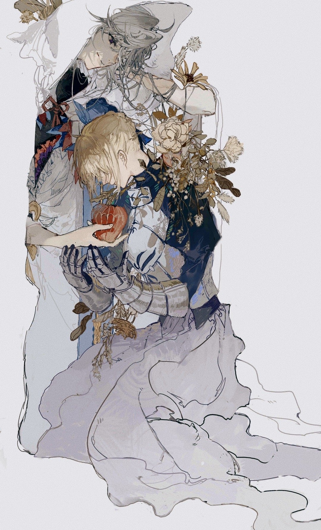 1boy 1girl apple armor artoria_pendragon_(fate) black_eyes black_shirt blending blonde_hair blue_bow blue_vest bow braid braided_bun breastplate bud chinese_commentary closed_mouth commentary_request dress eating fate/grand_order fate_(series) flower food fruit full_body gauntlets gou_haihaihaihai hair_bow hair_bun hair_over_eyes hand_in_own_hair highres holding holding_food holding_fruit hood hood_up hooded_robe kneeling long_dress merlin_(fate) red_ribbon ribbon robe saber_(fate) shirt short_hair single_hair_bun smile sunflower torn_clothes torn_dress vest white_dress white_flower white_hair white_robe wide_sleeves