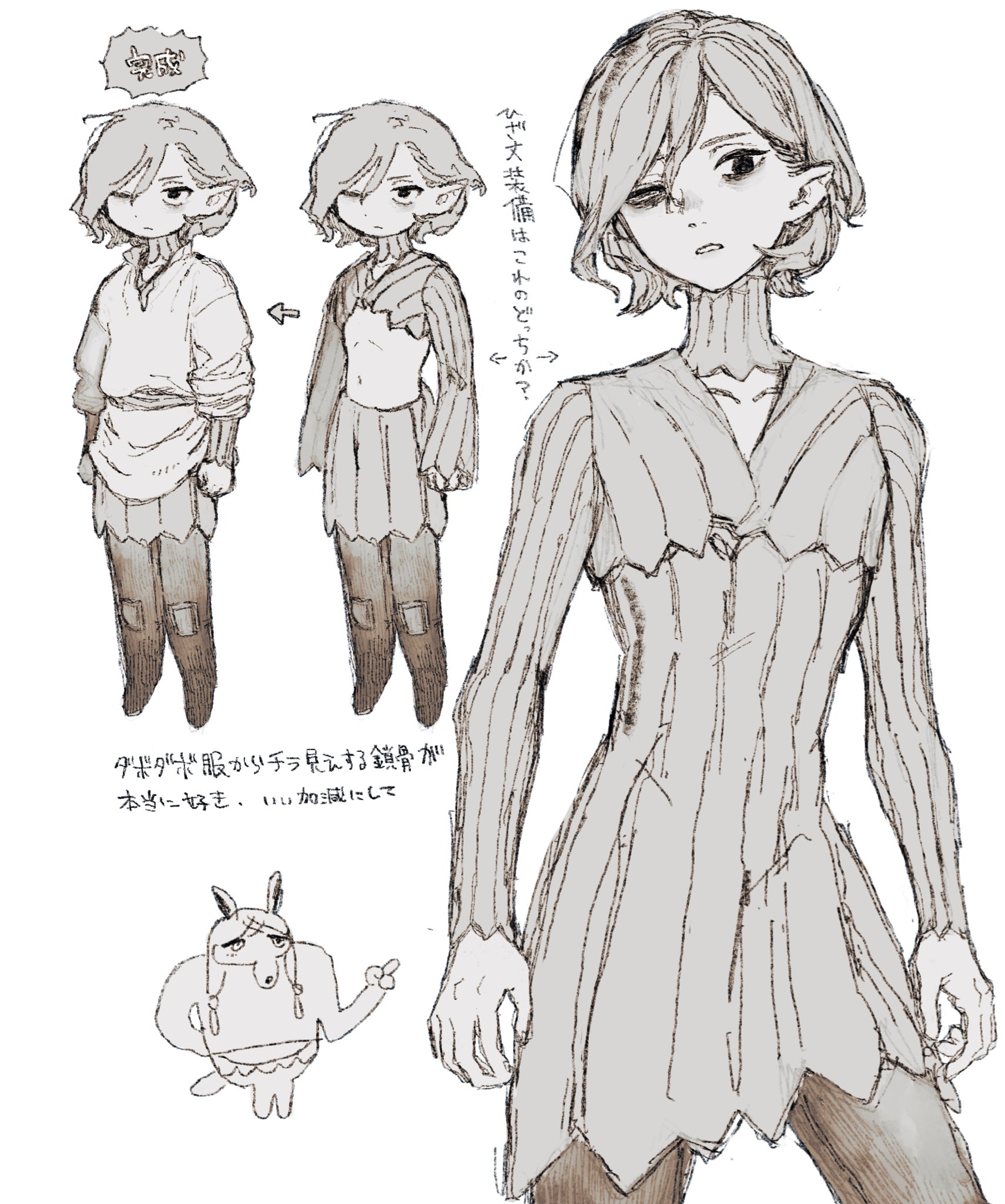 2boys 8x_xxx bags_under_eyes black_eyes chibi chibi_inset crop_top deformed dungeon_meshi elf gorget grey_hair highres long_sleeves looking_at_viewer lycion male_focus midriff mithrun multiple_boys multiple_views navel notched_ear one_eye_closed partially_undressed pointy_ears shirt short_hair simple_background skirt tunic wavy_hair white_background