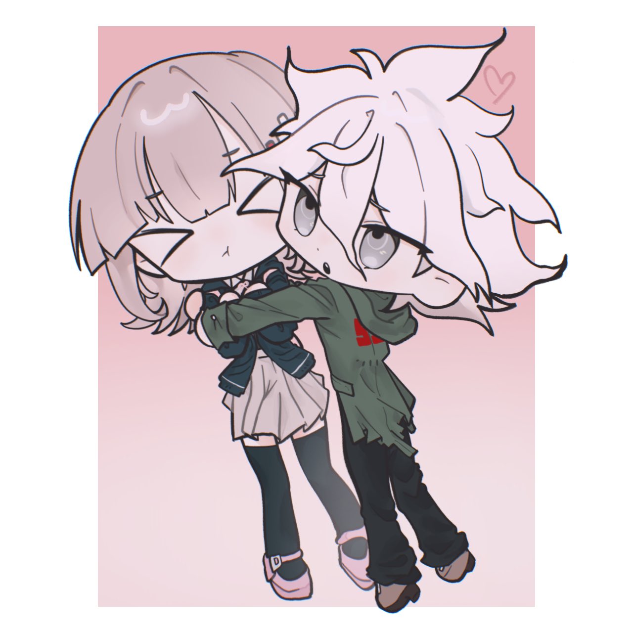 >_< 1boy 1girl :o :t black_thighhighs chibi danganronpa_(series) danganronpa_2:_goodbye_despair grey_eyes gyeolham highres hood hooded_jacket hug jacket komaeda_nagito long_sleeves nanami_chiaki pants pink_background pleated_skirt skirt teeth thighhighs upper_teeth_only white_background white_hair