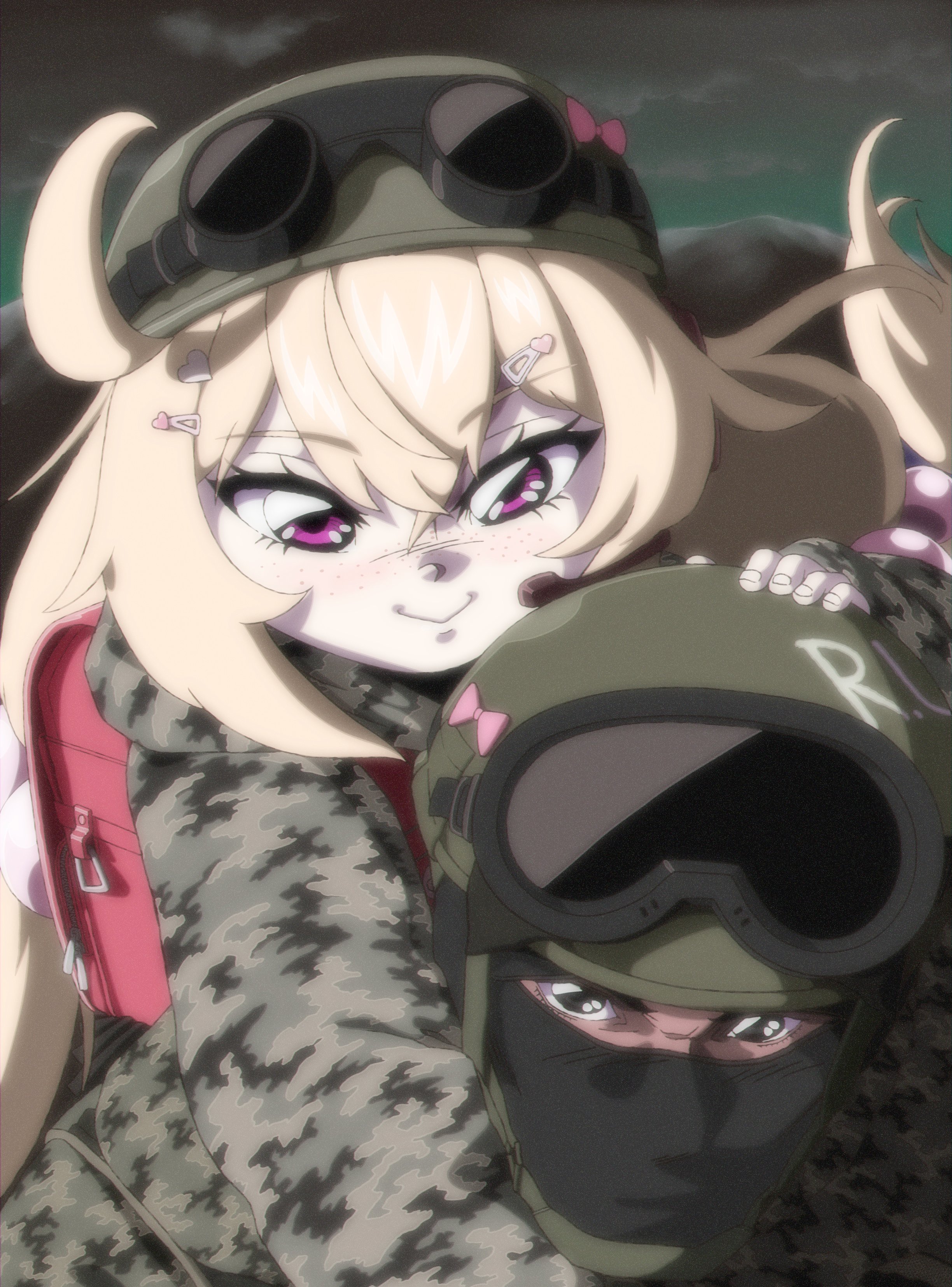 1boy 1girl absurdres backpack bag blonde_hair bow camouflage camouflage_jacket carrying child cloud cloudy_sky commentary_request freckles goggles goggles_on_head goggles_on_headwear green_helmet green_jacket hair_ornament hairclip hand_on_another's_head hat headset heart heart_hair_ornament helmet highres indie_virtual_youtuber jacket long_hair looking_at_viewer mask mberuhovy95 military_combat_uniform military_hat military_uniform mouth_mask night piggyback pink_bow purple_eyes randoseru red_bag ski_goggles sky smile spanish_commentary sylvie_ruru v-shaped_eyebrows virtual_youtuber