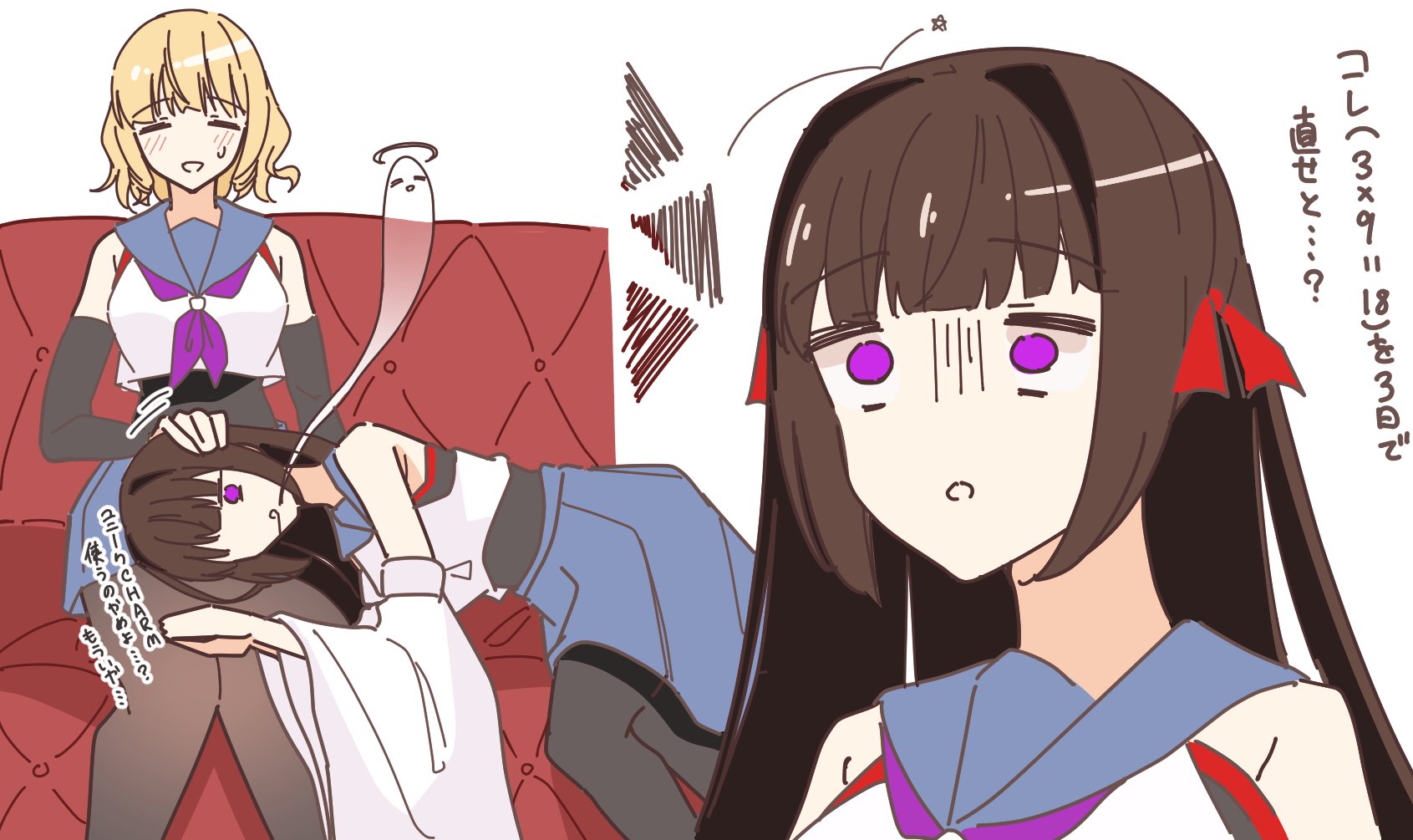 2girls =_= arm_at_side assault_lily bare_shoulders black_pantyhose black_shirt blonde_hair blue_sailor_collar blue_skirt blunt_bangs blush breasts brown_hair closed_eyes commentary_request couch crop_top detached_sleeves drooling exhausted feet_out_of_frame giving_up_the_ghost hair_ribbon hand_up hands_up headpat highres imamura_yukari_(assault_lily) knees_together_feet_apart kozue_west lap_pillow long_hair long_sleeves looking_ahead lying medium_breasts miniskirt motion_lines multiple_girls multiple_views natsumiya_kuina neckerchief no_pupils odaiba_girls_high_school_uniform on_couch on_side own_hands_together pantyhose parted_lips pleated_skirt purple_eyes purple_neckerchief red_ribbon ribbon sailor_collar school_uniform serafuku shirt short_hair shrug_(clothing) simple_background sitting skirt sleeveless sleeveless_shirt star_(symbol) sweatdrop translated undershirt upper_body white_background white_shrug wide-eyed wide_sleeves