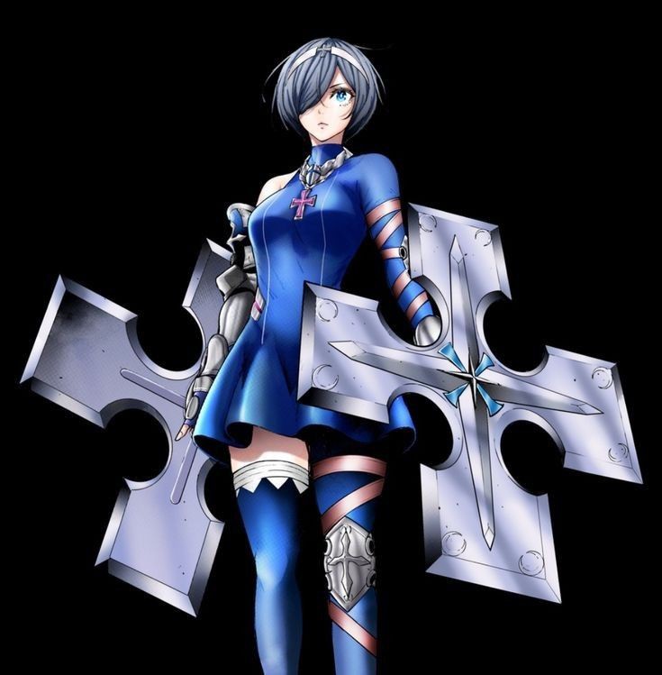 1girl black_background blue_dress blue_eyes blue_hair blush breasts closed_mouth dress female_focus full_body jeanne_d'arc_(majo_taisen_chronicle) majo_taisen_chronicle short_hair solo