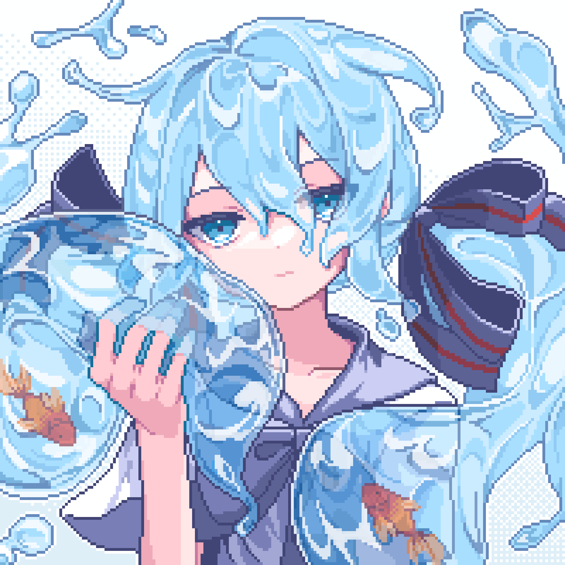 1girl amefu_luna blue_eyes blue_hair bottle_miku bow closed_mouth commentary expressionless eyes_visible_through_hair fish hair_between_eyes hair_bow half-closed_eyes hand_up hatsune_miku highres hydrokinesis liquid_hair looking_at_viewer pixel_art purple_bow purple_sailor_collar sailor_collar shaped_liquid shirt short_hair short_sleeves solo upper_body vocaloid water white_shirt