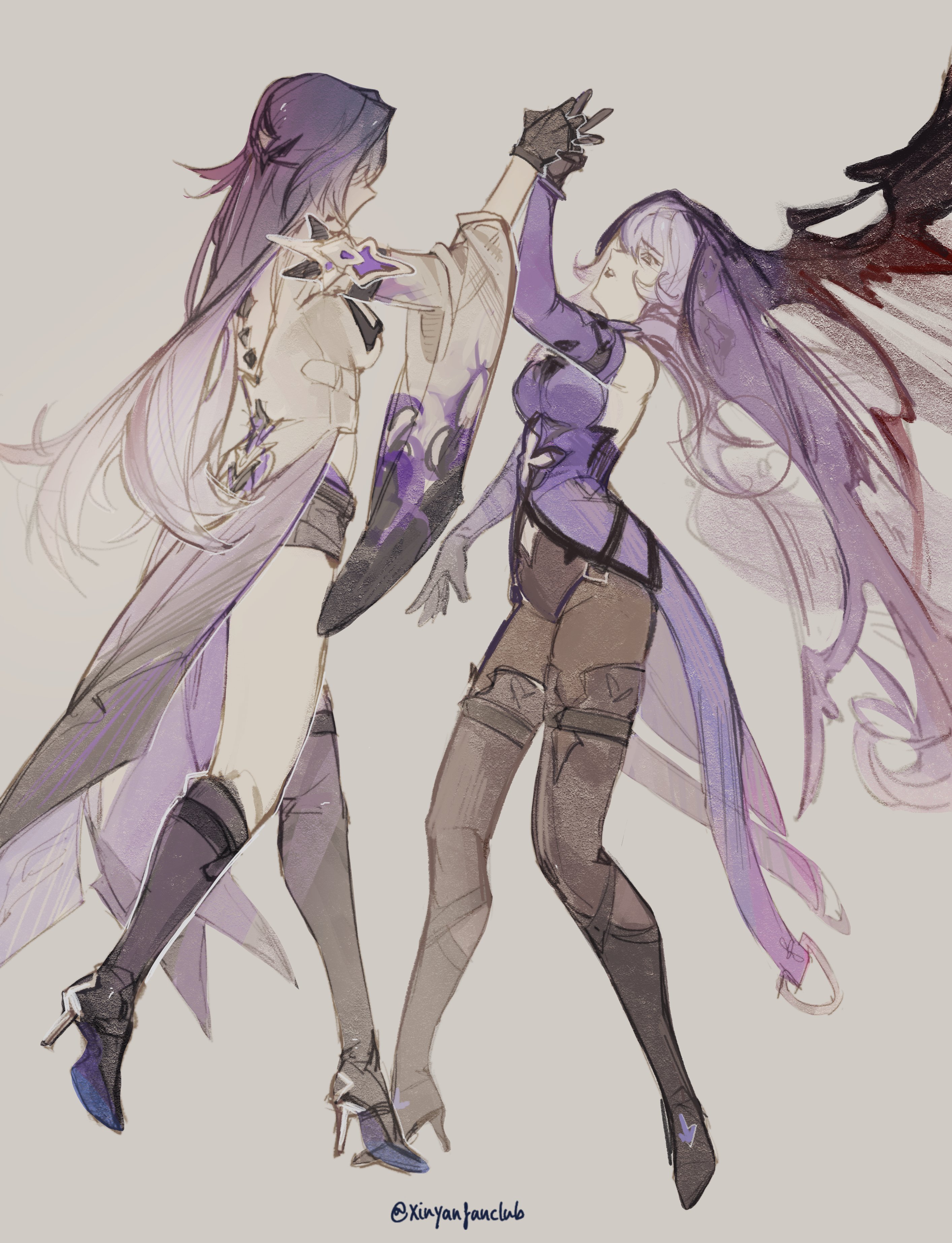 2girls absurdres acheron_(honkai:_star_rail) black_gloves black_shorts black_swan_(honkai:_star_rail) boots coat detached_sleeves full_body gloves high_heel_boots high_heels highres holding_hands honkai:_star_rail honkai_(series) knee_boots long_hair multiple_girls nia_(xinyanfanclub) purple_hair purple_veil shorts signature thigh_boots twitter_username veil white_background white_coat white_hair yuri