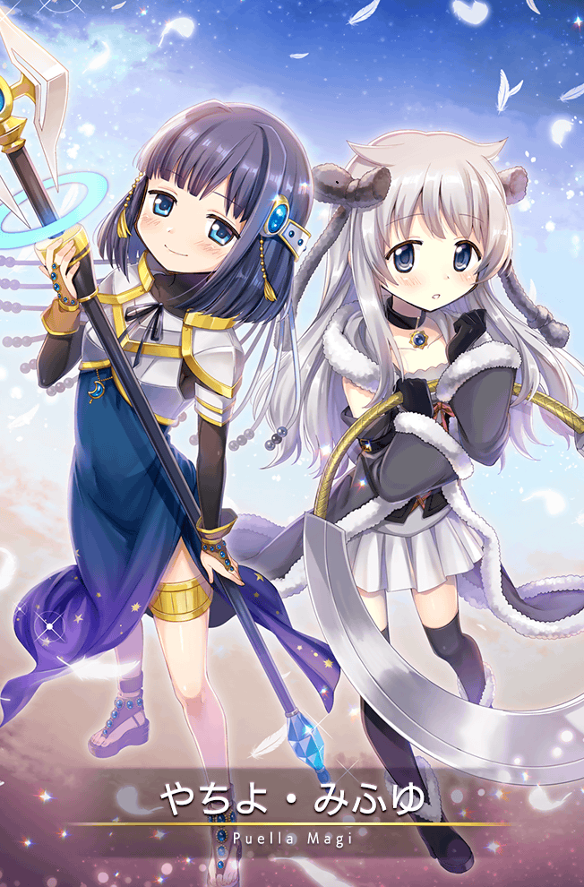 2girls animal_collar arm_belt armor azusa_mifuyu azusa_mifuyu_(hajimari_ver.) belt black_belt black_bow black_collar black_footwear black_gem black_gloves black_ribbon black_shirt black_thighhighs blue_dress blue_eyes blue_gem blue_hair blue_sky boots bow breastplate bridal_gauntlets brown_bridal_gauntlets brown_footwear card_(medium) chakram character_name clenched_hands closed_mouth cloud collar collarbone crescent cross-laced_clothes cross-laced_top day detached_sleeves dress full_body fur-trimmed_boots fur-trimmed_hood fur-trimmed_jacket fur-trimmed_sleeves fur_trim game_cg gem glaive_(polearm) gloves gradient_clothes gradient_dress grey_eyes grey_hair grey_jacket grey_sleeves hair_bow hair_ears holding holding_polearm holding_weapon hood hood_down hooded_jacket jacket kuronyan light_blush light_particles long_dress long_hair long_sleeves looking_at_viewer magia_record:_mahou_shoujo_madoka_magica_gaiden magical_girl mahou_shoujo_madoka_magica multiple_girls nanami_yachiyo neck_ribbon official_alternate_hair_length official_alternate_hairstyle official_art outdoors outline parted_lips pauldrons petals pink_ribbon pleated_skirt polearm ribbon sandals shirt short_hair shoulder_armor side_slit skirt sky sleeveless sleeveless_jacket smile sparkle starry_sky_print string thigh_strap thighhighs toes turtleneck turtleneck_shirt vest weapon white_dress white_outline white_vest