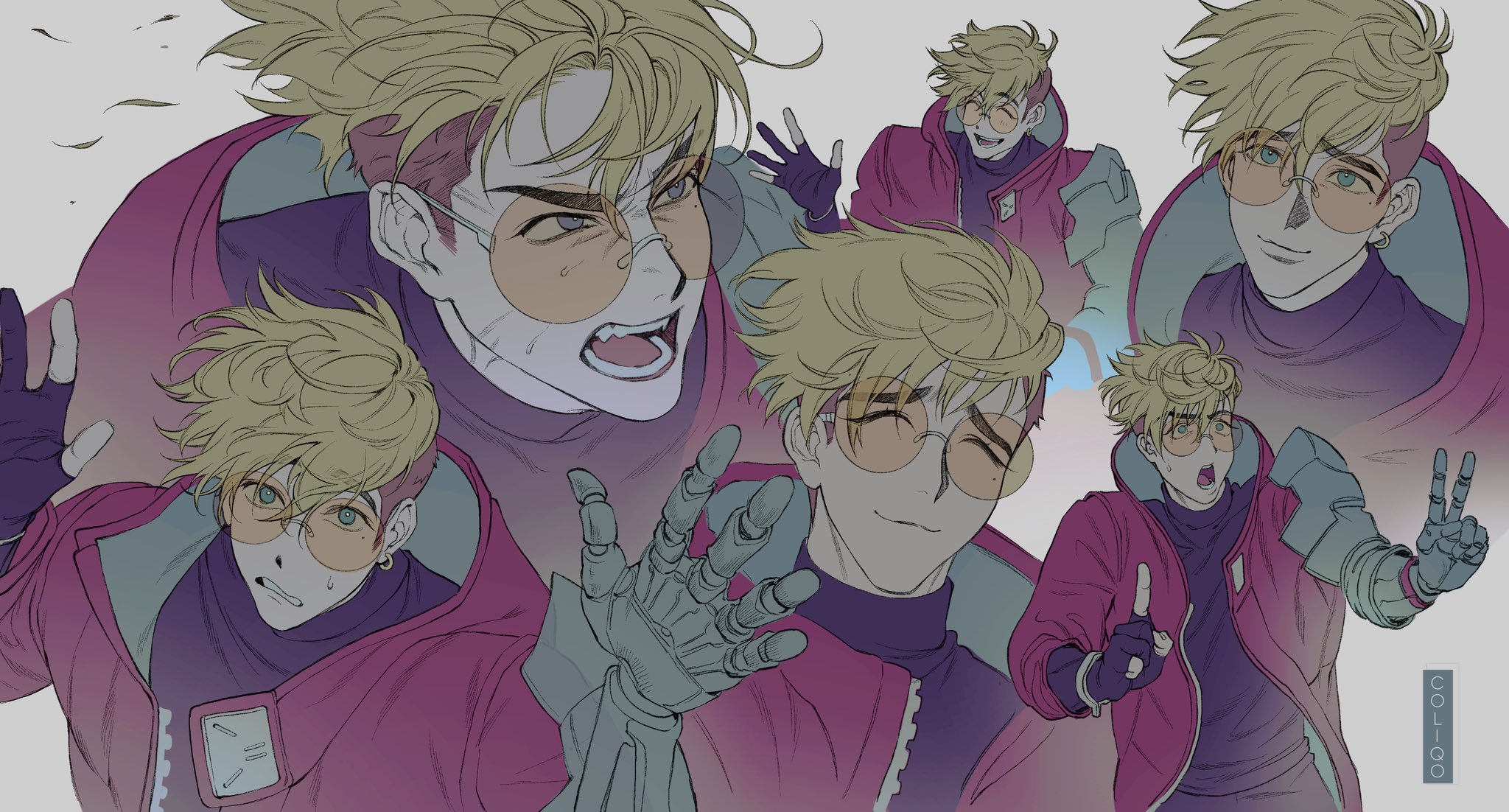 1boy :3 angry artist_name asymmetrical_hair bishounen black_gloves black_shirt blonde_hair blue_eyes closed_eyes coliqo commentary earrings multiple_expressions glasses gloves high_collar highres hood jacket jewelry looking_at_viewer looking_to_the_side male_focus mechanical_arms mole mole_under_eye multiple_views orange-tinted_eyewear pursed_lips red_jacket shirt short_hair sidecut simple_background single_earring single_mechanical_arm smile surprised sweat thick_eyebrows tinted_eyewear trigun trigun_stampede undercut upper_body v vash_the_stampede white_background