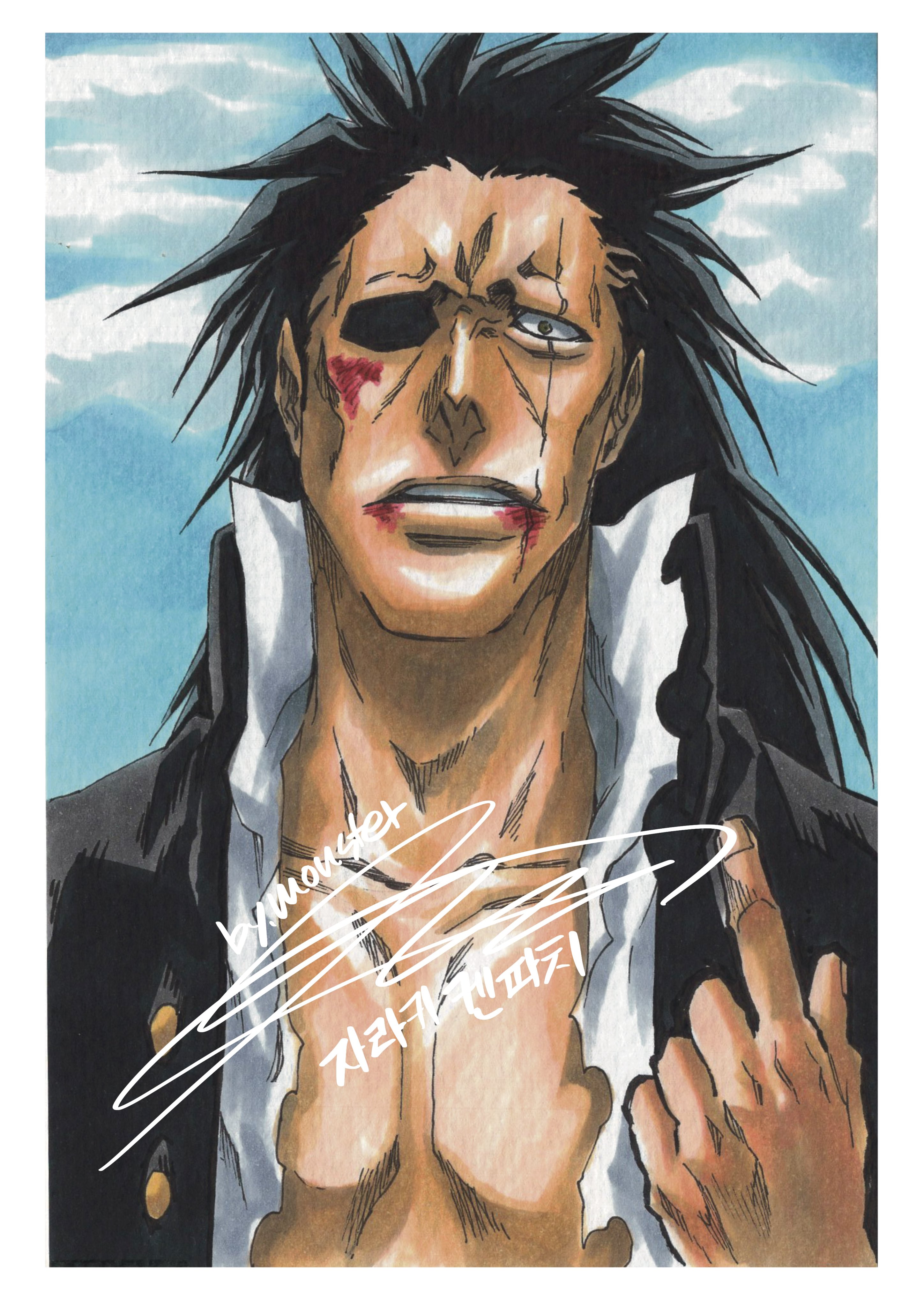 1boy absurdres artist_name black_hair black_jacket bleach blood blood_from_mouth blood_on_face blue_sky cloud come_at_me_bro eyepatch hand_up highres jacket long_hair looking_at_viewer male_focus monster_art_(rlawnsgr7) parted_lips portrait scar scar_across_eye scar_on_face school_uniform shirt sky solo torn_clothes torn_shirt white_shirt yellow_eyes zaraki_kenpachi