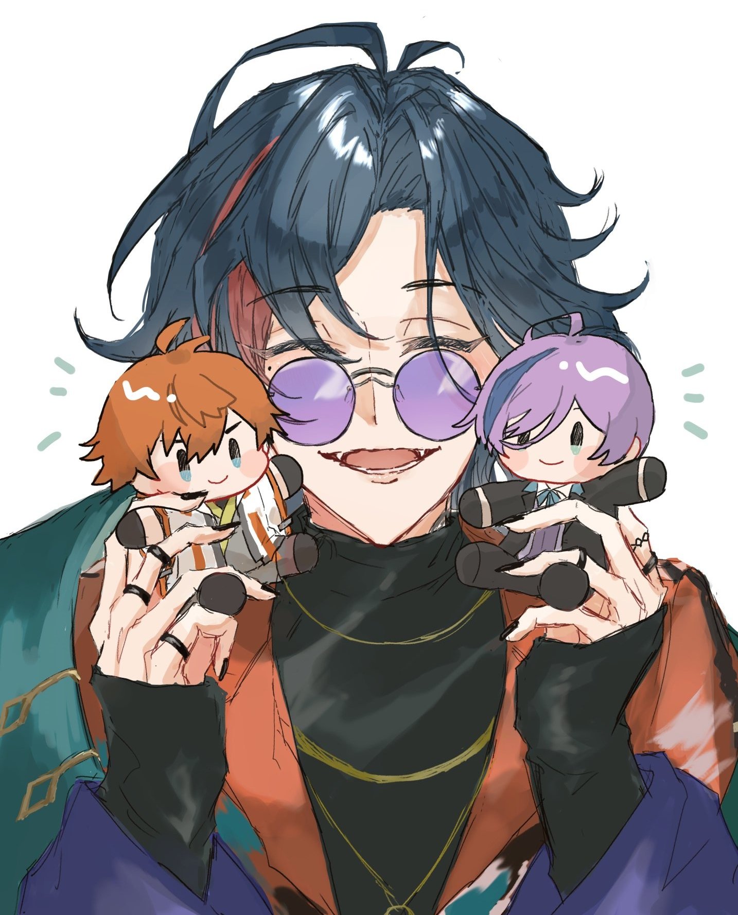 1boy 3skm_(nijisanji) antenna_hair arm_warmers black_arm_warmers black_hair black_shirt blue_hair character_doll closed_eyes doll gold_necklace highres jacket jewelry kaisei_(1st_costume)_(nijisanji) kaisei_(nijisanji) kitami_yusei kitami_yusei_(1st_costume) long_sleeves mamai_(mmmmai1205) mole mole_under_eye multicolored_hair necklace nijisanji open_mouth orange_hair purple-tinted_eyewear purple_hair red_hair red_jacket ring sakaki_ness sakaki_ness_(1st_costume) shirt simple_background smile streaked_hair tinted_eyewear turtleneck turtleneck_shirt virtual_youtuber white_background
