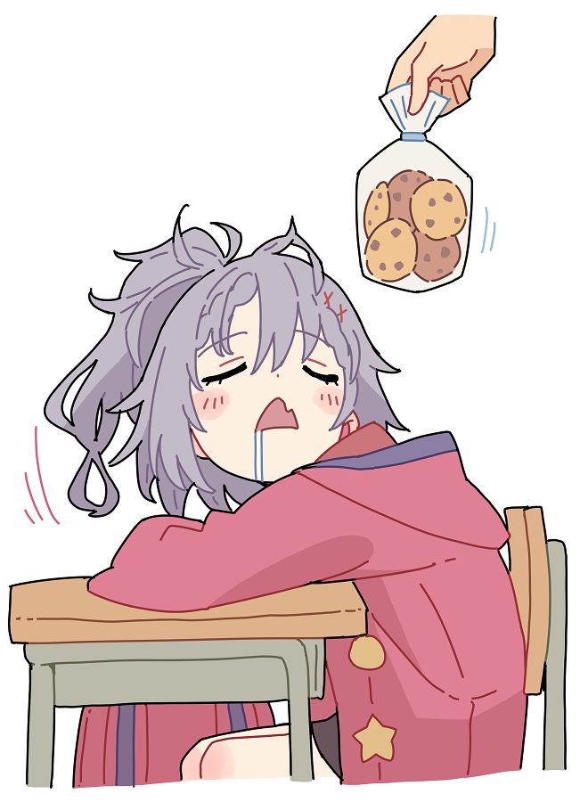 1girl 1other bag bag_of_cookies blush_stickers chair commentary cookie desk disembodied_hand fang food motion_lines narumi_arata original plastic_bag saliva saliva_trail school_bag school_chair school_desk simple_background skin_fang sleepy socks solo tsugumi_taro