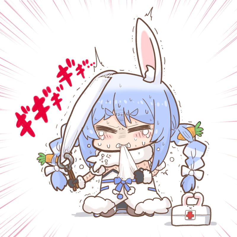 1girl animal_ear_fluff animal_ears biting blue_hair blush braid carrot_hair_ornament chibi chibi_only closed_eyes don-chan_(usada_pekora) emphasis_lines first_aid_kit food-themed_hair_ornament full_body hair_between_eyes hair_ornament holding_pliers hololive matarou_(matarou072) napkin pliers rabbit_ears rabbit_girl solo thick_eyebrows translation_request twin_braids usada_pekora usada_pekora_(1st_costume) virtual_youtuber white_background