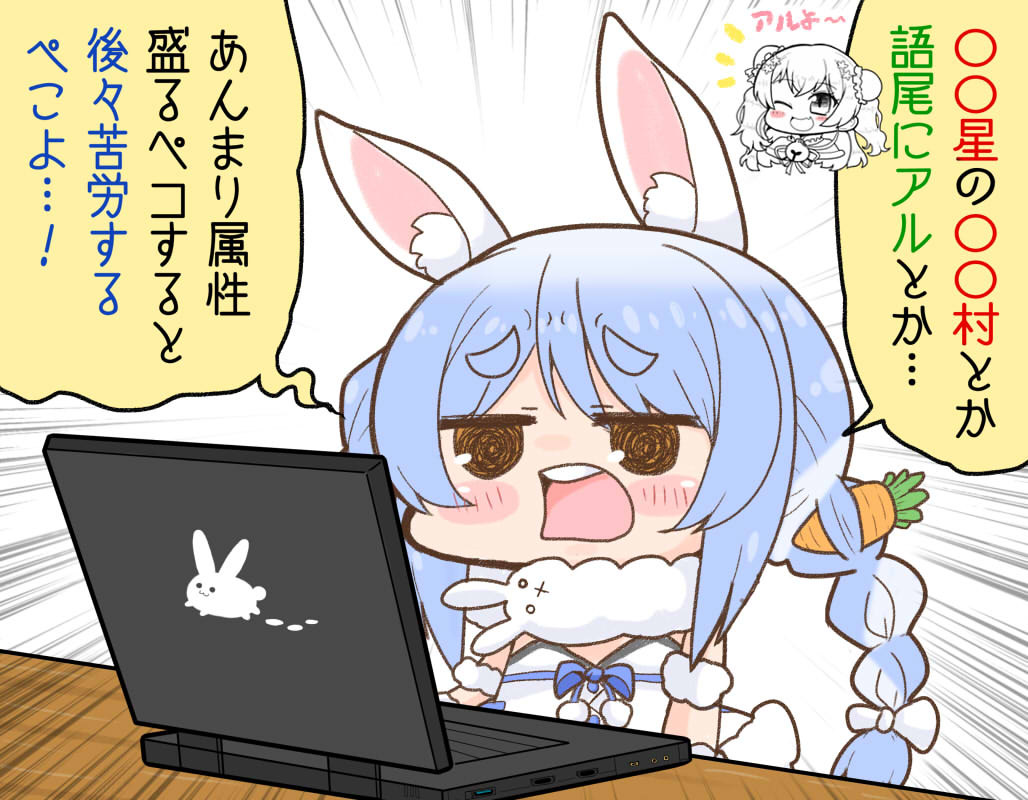 1girl animal_ear_fluff animal_ears blue_hair carrot_hair_ornament chibi chibi_only computer emphasis_lines food-themed_hair_ornament hair_ornament hololive laptop matarou_(matarou072) momosuzu_nene open_mouth pom_pom_(clothes) rabbit_ears shirt speech_bubble thick_eyebrows translation_request twintails usada_pekora usada_pekora_(1st_costume) virtual_youtuber white_shirt