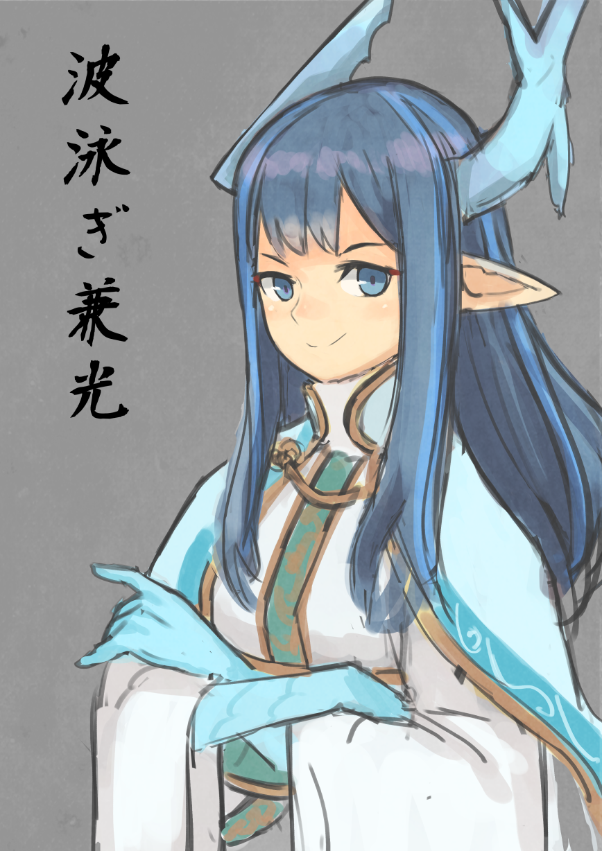 1girl blue_capelet blue_eyes blue_gloves blue_hair capelet character_name closed_mouth commentary_request crossed_arms dragon_horns elbow_gloves gloves highres horns japanese_clothes kimono light_blue_hair long_hair long_sleeves looking_at_viewer multicolored_hair nami'oyogi_kanemitsu pointy_ears sidelocks sketch smile solo tenka_hyakken two-tone_hair white_kimono wide_sleeves zijou