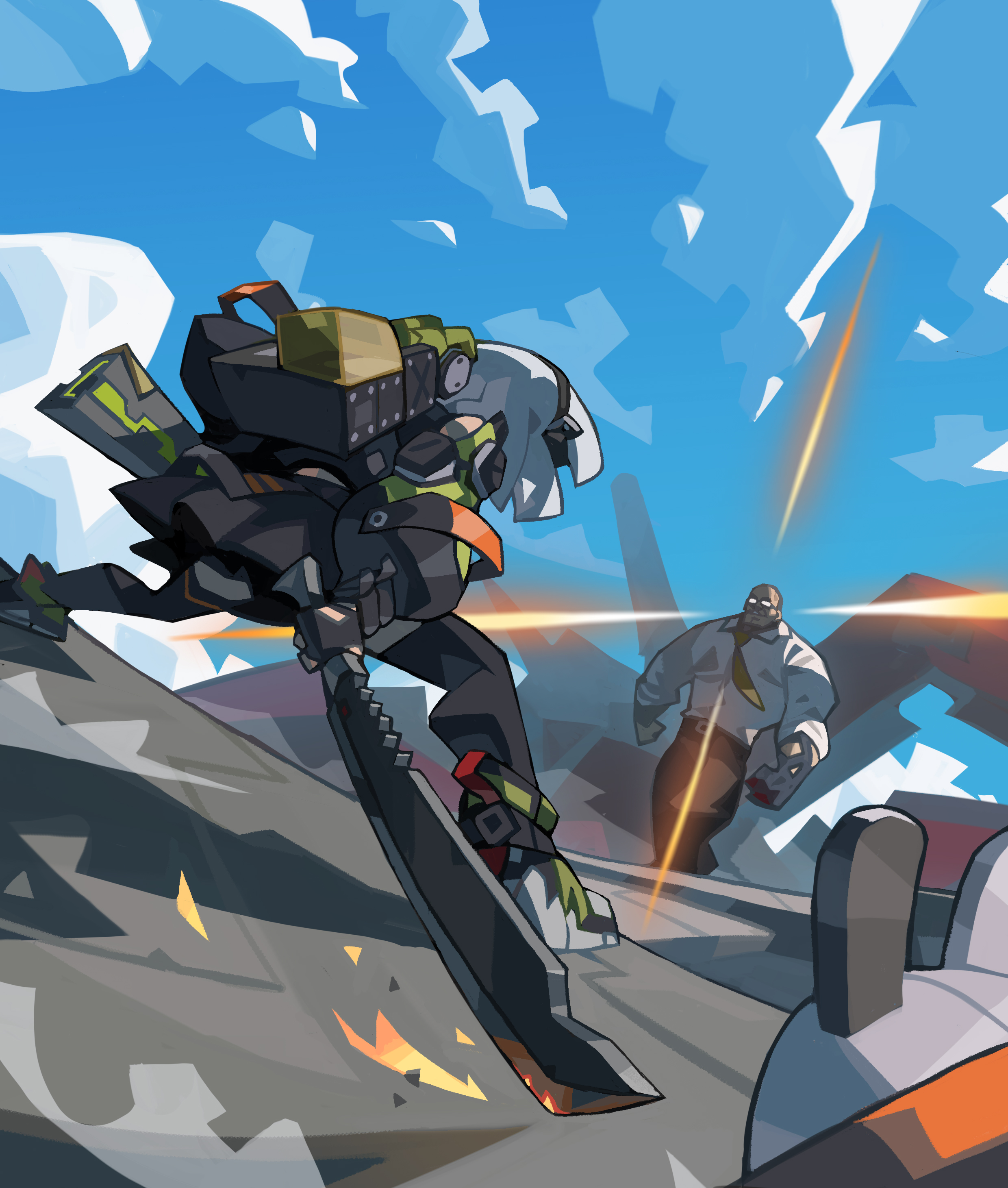 1boy 1girl absurdres anby_demara backpack bag bangboo_(zenless_zone_zero) black_pants black_skirt day fighting_stance grey_hair highres holding holding_sword holding_weapon long_sleeves metal_gear_(series) metal_gear_rising:_revengeance muscular muscular_male necktie niking outdoors pants puffy_long_sleeves puffy_sleeves shirt skirt steven_armstrong sword weapon white_shirt yellow_necktie zenless_zone_zero