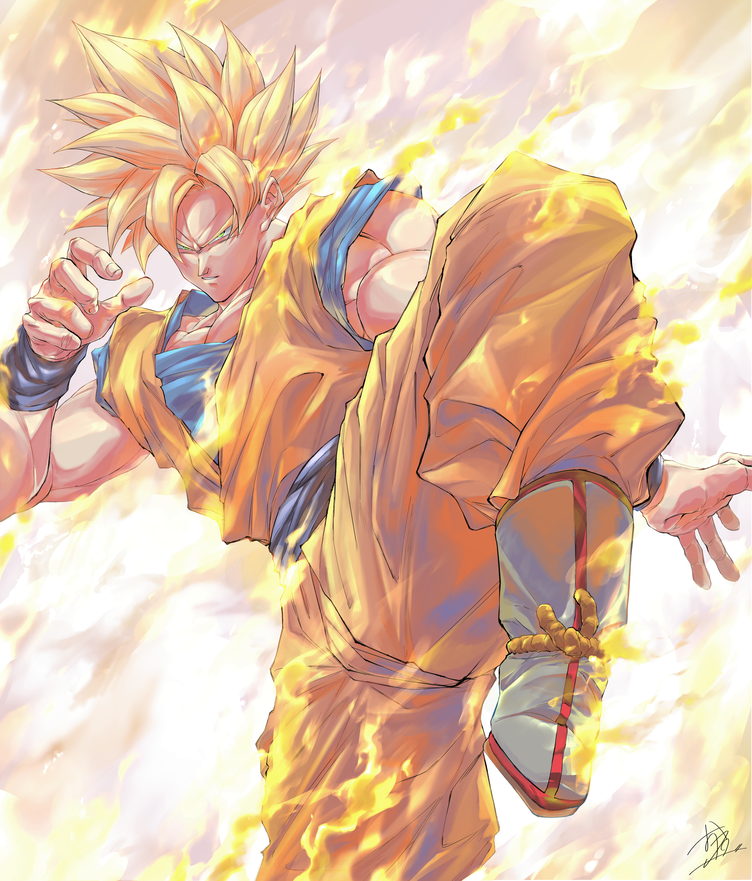 1boy absurdres aura blonde_hair blue_eyes blue_sash dougi dragon_ball dragonball_z fighting_stance fire highres leg_up looking_at_viewer male_focus muscular muscular_male orange_pants ota_ta999 pants sash short_hair solo son_goku spiked_hair super_saiyan super_saiyan_1 wristband