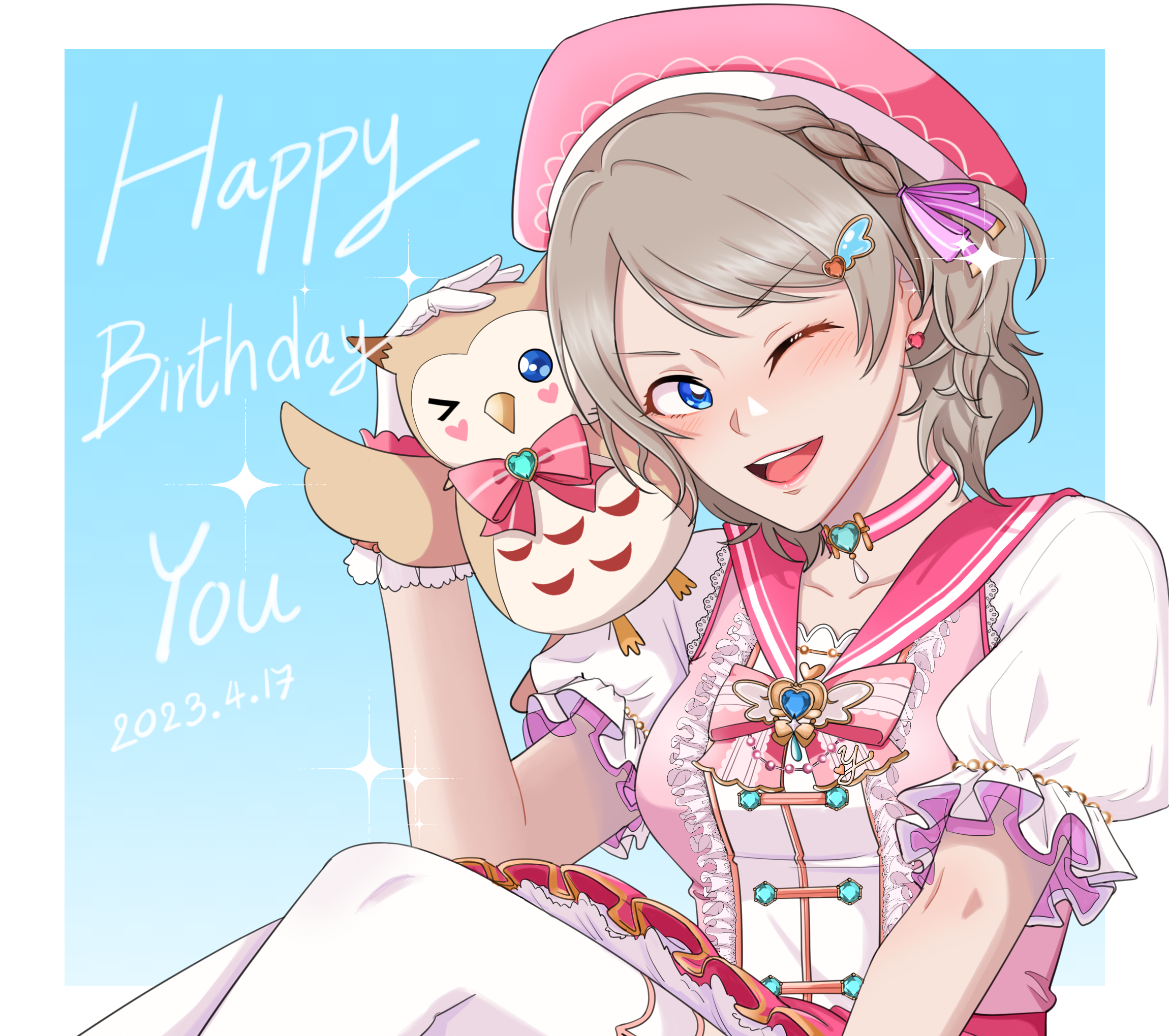 1girl bird blue_eyes blush brown_hair dress frills gem highres jorpxn looking_at_viewer love_live! love_live!_sunshine!! open_mouth owl shirt simple_background stuffed_toy thighs watanabe_you