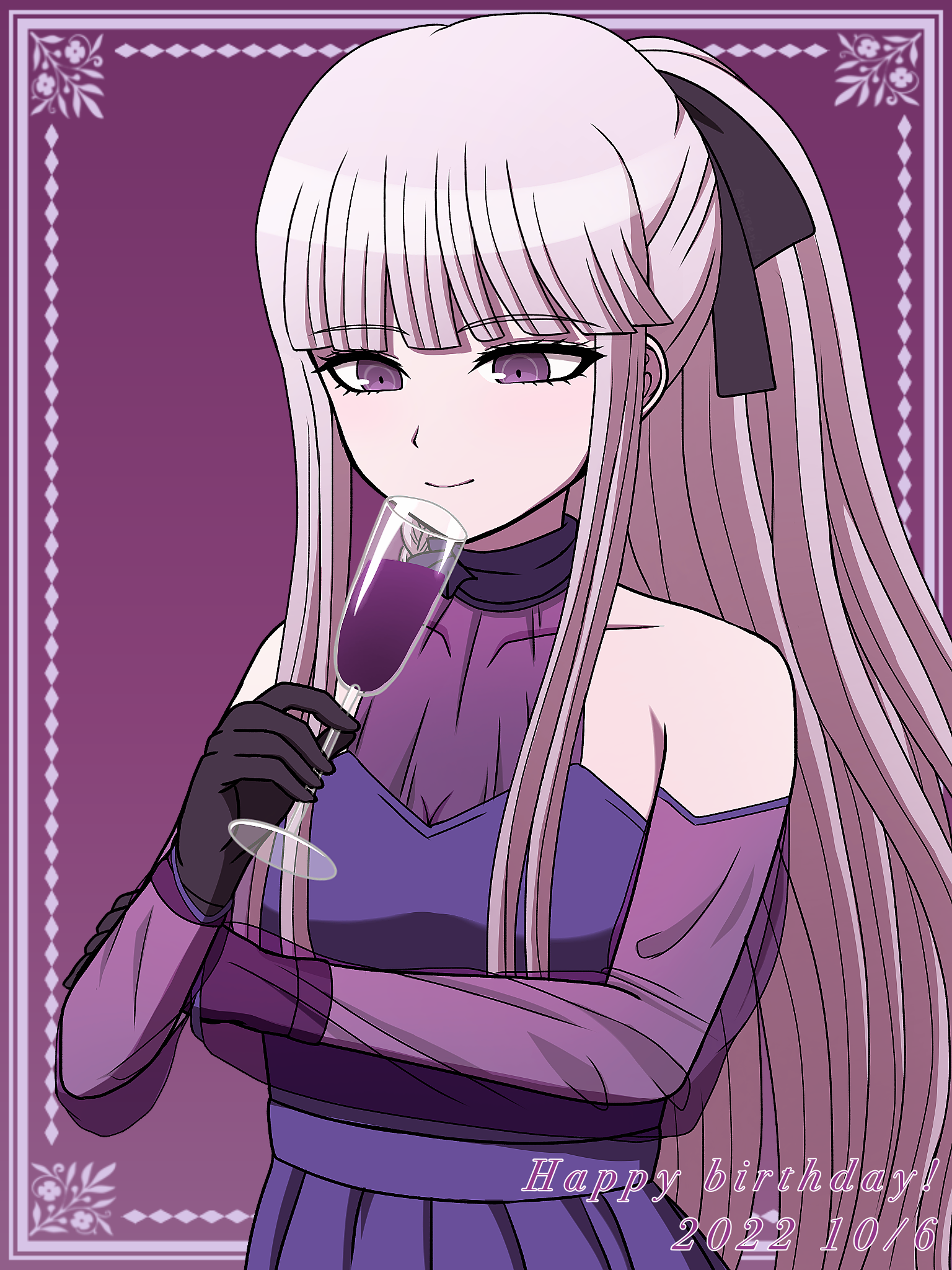 1girl bare_shoulders black_gloves black_ribbon breasts cleavage covered_collarbone cup danganronpa:_trigger_happy_havoc danganronpa_(series) danganronpa_10th_anniversary_costume dated detached_sleeves dress drinking_glass gloves grey_hair hair_ribbon happy_birthday highres holding holding_cup kirigiri_kyoko long_hair medium_breasts ponytail purple_background purple_eyes ribbon see-through_clothes see-through_sleeves smile solo suiren_yurei upper_body wine_glass
