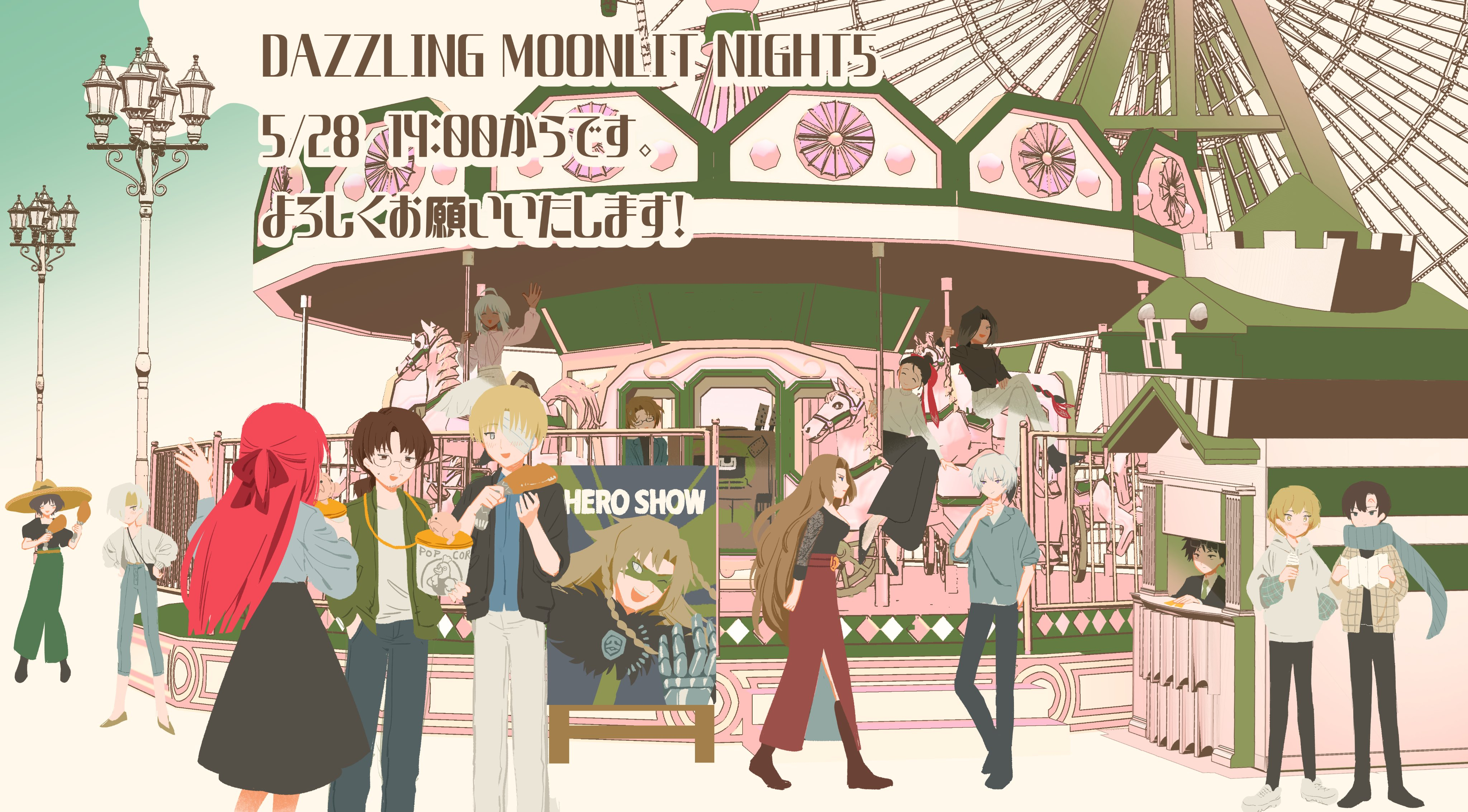 6+boys 6+girls absurdres aida_(project_moon) aya_(project_moon) blue_shirt blue_skirt bongy_(project_moon) brown_hair carousel closed_mouth dazzling_moonlit_night demian_(project_moon) dongbaek_(project_moon) effie_(project_moon) ferris_wheel gregor_(project_moon) hat highres hopkins_(project_moon) instrument kromer_(project_moon) limbus_company long_hair long_skirt long_sleeves low_ponytail maracas mogura_panda multiple_boys multiple_girls pants papa_bongy_(project_moon) ponytail project_moon puffy_long_sleeves puffy_sleeves red_pants red_skirt samjo_(project_moon) saude_(project_moon) shirt siegfried_(project_moon) sinclair_(project_moon) skirt smile sombrero sonya_(project_moon) tieqiu_boss_(project_moon) tomah_(project_moon) very_long_hair white_hair yuri_(project_moon)