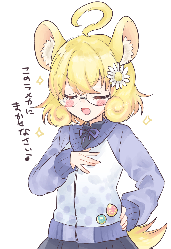 1girl ahoge animal_ear_fluff blonde_hair blush chinchilla_ears chinchilla_girl chinchilla_tail closed_eyes cowboy_shot crossed_bangs curly_hair facing_viewer flower glasses hair_flower hair_ornament hand_on_own_chest hand_on_own_hip jacket mikan_tabetai open_mouth purple_jacket rameca_(show_by_rock!!) round_eyewear short_hair show_by_rock!! simple_background smile solo sparkle standing translated white_background