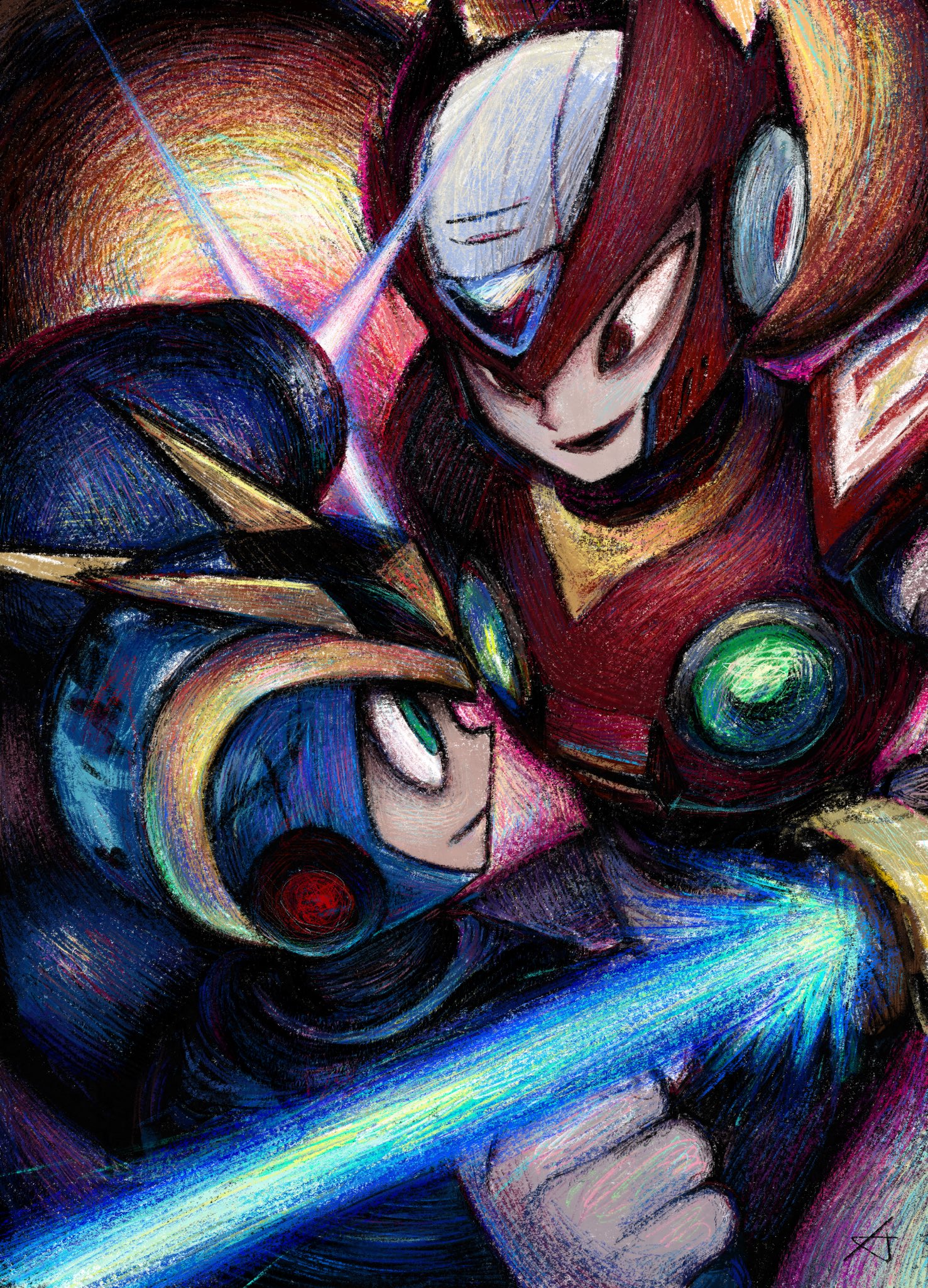 2boys android arm_cannon armor blue_armor blue_helmet chest_jewel energy_blade energy_blast energy_sword expressionless fake_horns fighting forehead_jewel gem gloves gold_trim green_eyes green_gem helmet highres horned_helmet horns karen_(karenoni1031) male_focus mega_man_(series) mega_man_zero_(series) mega_man_zero_2 multiple_boys no_ears open_mouth pale_skin powering_up red_armor red_helmet robot shoulder_armor sketch smile squinting sword ultimate_armor_x_(mega_man) weapon white_gloves white_helmet x_(mega_man) z_saber zero_(mega_man)