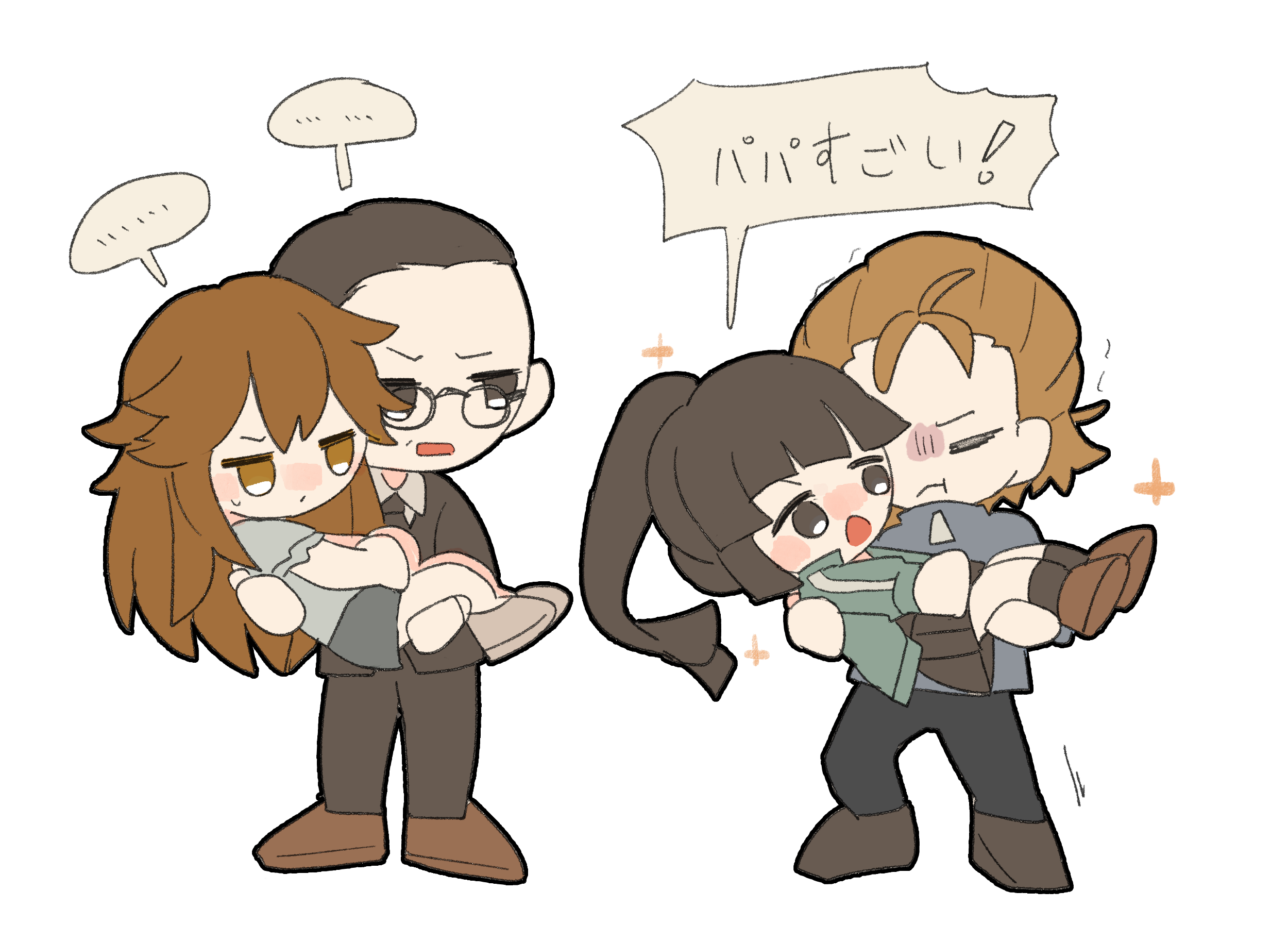 ... 2boys 2girls aqua_shirt black_eyes black_hair black_jacket black_skirt black_socks blunt_bangs brown_shoes carrying chibi chibi_only closed_eyes closed_mouth commentary_request deformed father_and_child father_and_daughter grey_shirt grey_skirt hanaya_(fude) highres jacket jitome kumazaki_karen kumazaki_riku kurachi_seira kurachi_terumi long_hair long_sleeves multiple_boys multiple_girls official_alternate_costume open_mouth parent_and_child pleated_skirt ponytail princess_carry saibou_shinkyoku shirt shoes short_sleeves simple_background skirt socks spoken_ellipsis sweat translated white_background
