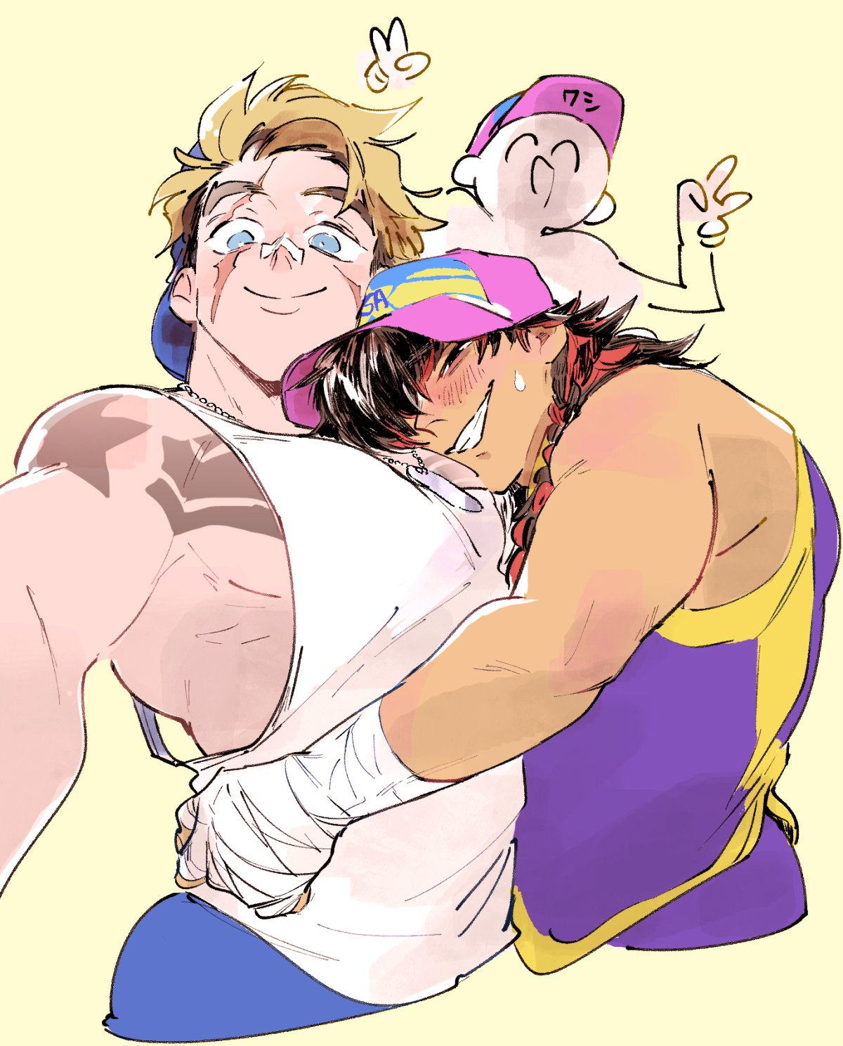 2boys arm_around_another's_waist arm_tattoo bandage_on_face bandages bare_shoulders baseball_cap black_hair blonde_hair blue_eyes blue_pants blush bosch_(street_fighter) brown_eyes chest_tattoo couple covered_pectorals cropped_arm dog_tags egr_health facial_scar grin hand_wraps hat head_on_another's_shoulder highres large_pectorals looking_at_viewer luke_sullivan male_focus multicolored_clothes multicolored_hair multiple_boys multiple_scars muscular muscular_male pants pectorals people player_character_(street_fighter_6) purple_pants purple_shirt scar scar_across_eye scar_on_cheek scar_on_face shirt simple_background sleeveless sleeveless_shirt smile star_(symbol) street_fighter street_fighter_6 tattoo two-tone_hair upper_body v white_shirt yellow_background yellow_trim