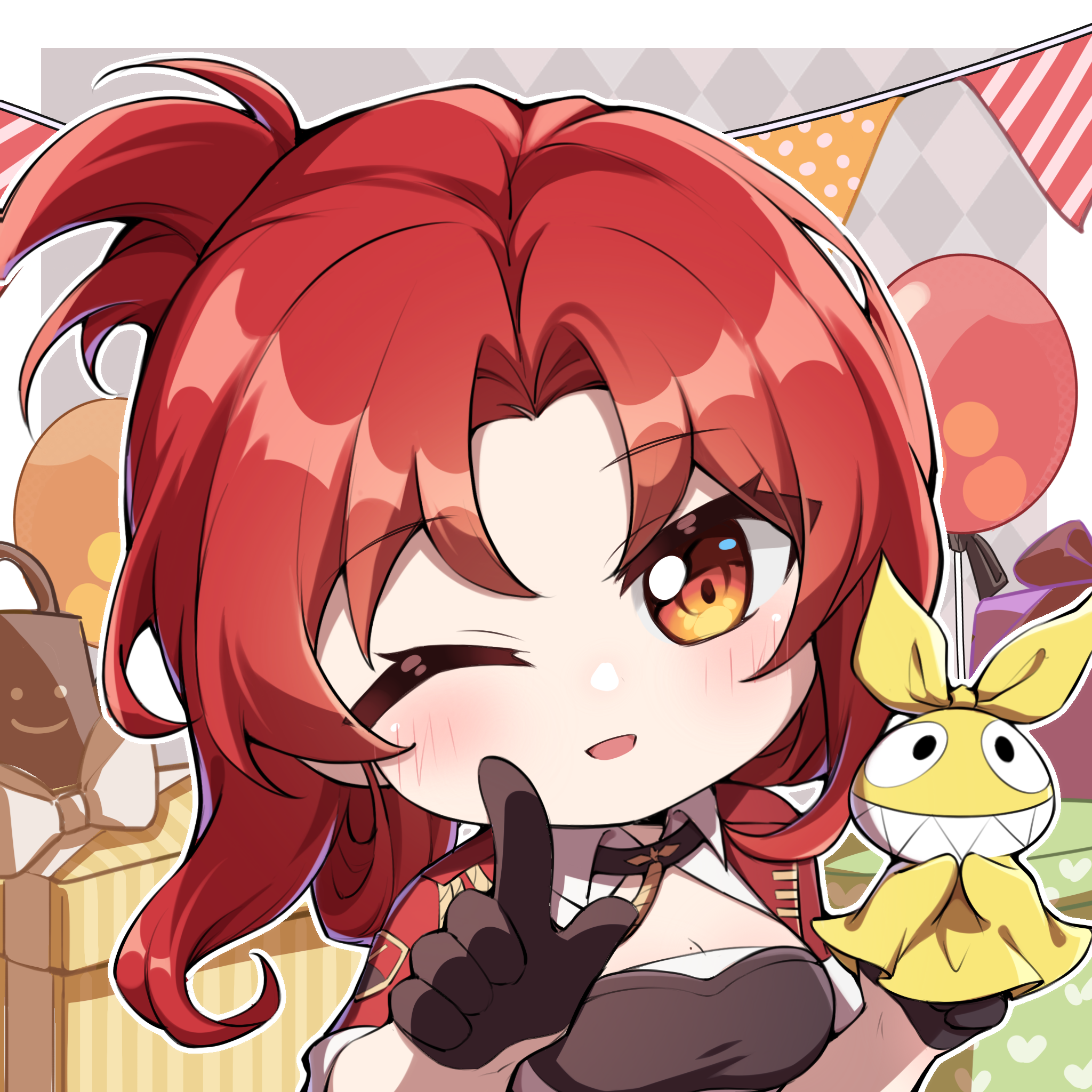 1girl :d balloon black_gloves black_shirt box breasts chibi cleavage doll gift gift_box gloves highres holding holding_doll homu_(honkai_impact) honkai_(series) honkai_impact_3rd long_hair murata_himeko murata_himeko_(battle_storm) one_eye_closed open_mouth orange_eyes pointing pointing_at_viewer red_hair shirt smile xinzhizhu