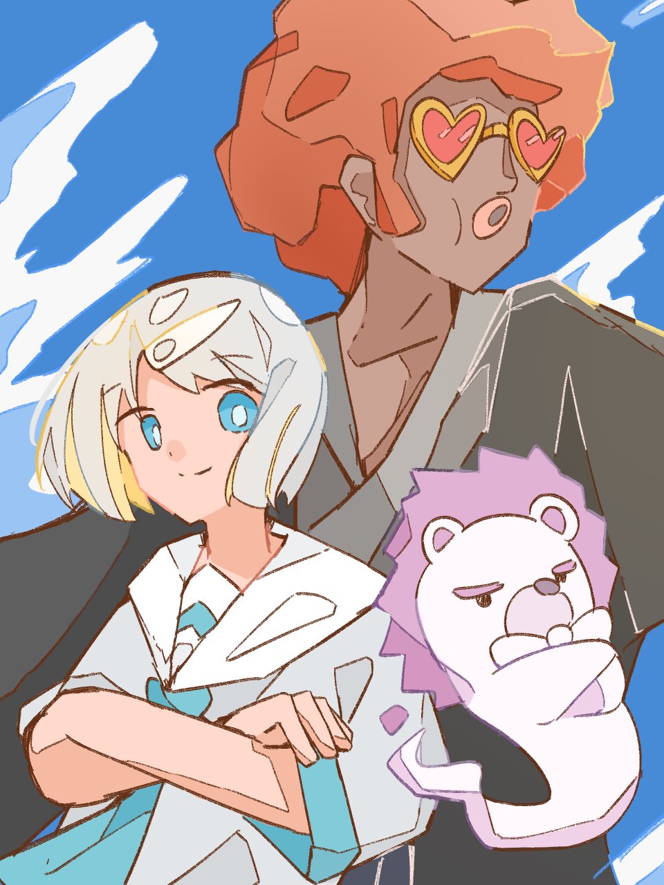 blue_eyes colored_inner_hair crossed_arms glasses hair_ornament hairclip hedgehog highres looking_at_viewer multicolored_hair nezumindazo nira-chan orange_eyes smile tan two-tone_hair uniguri_(zutomayo) white_hair zutto_mayonaka_de_ii_no_ni