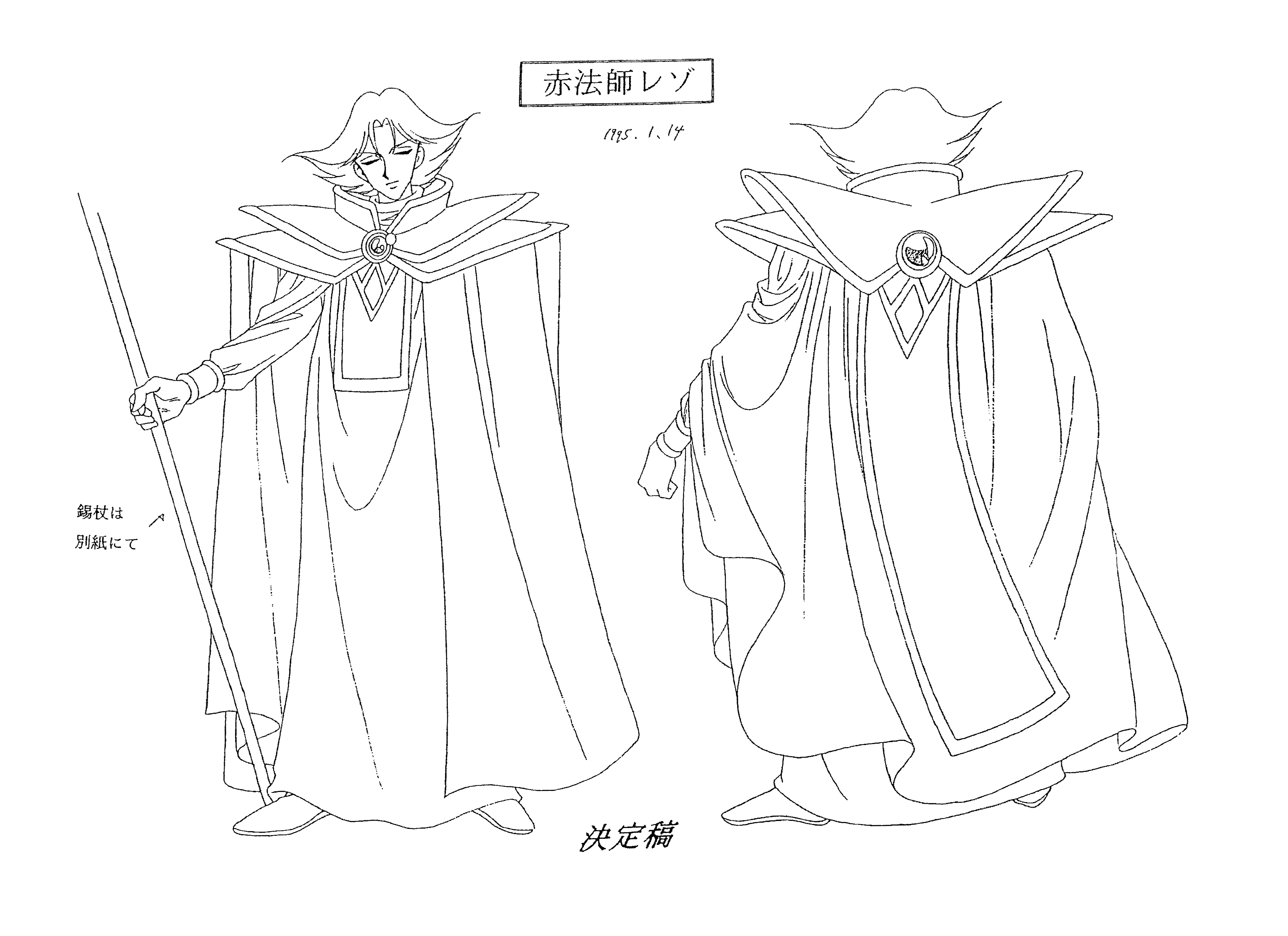 1990s_(style) 1boy absurdres blind reference_sheet closed_eyes full_body highres holding holding_staff monochrome multiple_views non-web_source official_art retro_artstyle rezo_the_red_priest serious short_hair simple_background slayers staff translation_request white_background wizard