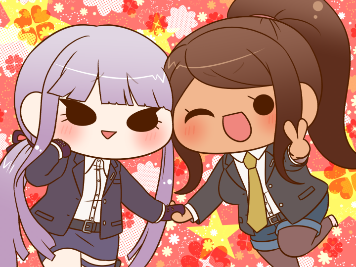 2girls asahina_aoi belt belt_buckle black_belt black_eyes black_jacket blazer blue_shorts blunt_bangs blunt_ends breasts brown_hair buckle buttons chibi collared_jacket collared_shirt commentary_request cowboy_shot danganronpa_(series) danganronpa_3_(anime) dark-skinned_female dark_skin denim denim_shorts dress_shirt eyelashes floral_background gloves grey_pantyhose hair_ribbon hand_on_own_cheek hand_on_own_face happy holding_hands holster jacket kirigiri_kyoko lapel_pin lapels large_breasts layered_sleeves leg_up light_blush long_hair long_sleeves looking_at_viewer low_ponytail miniskirt multiple_girls neckerchief notched_lapels one_eye_closed open_clothes open_jacket orange_background pale_skin pantyhose pencil_skirt pocket ponytail purple_belt purple_gloves purple_hair purple_jacket purple_ribbon purple_skirt ribbon shirt shoes shorts sidelocks skirt smile solid_circle_eyes sparkle star_(symbol) studded_gloves thigh_belt thigh_strap triangle_mouth v v-shaped_eyebrows white_footwear white_shirt yellow_neckerchief yumaru_(marumarumaru)