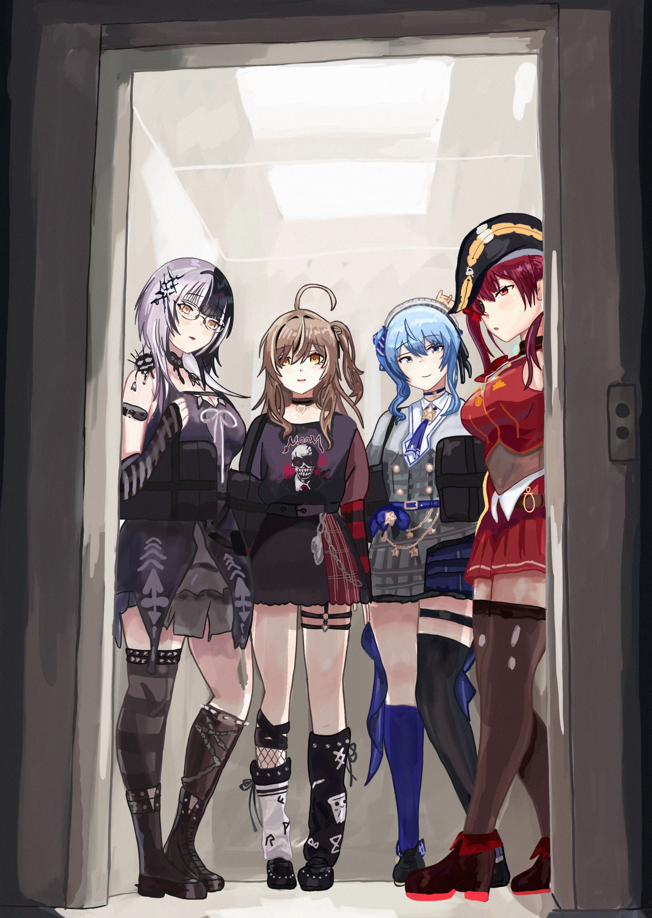 4girls absurdres ahoge ankle_boots arm_warmers ascot asymmetrical_legwear belt beret bicorne black_choker black_dress black_footwear black_hair black_hat black_leg_warmers black_shirt black_socks black_thighhighs blue_ascot blue_belt blue_eyes blue_hair blue_ribbon blue_socks boots breasts brown_eyes brown_footwear brown_hair brown_thighhighs choker closed_mouth commentary cropped_jacket dress elevator emo_fashion english_commentary eyepatch fishnet_socks fishnets fold-over_boots full_body grey_hair grey_hat grey_jacket grey_skirt hair_ribbon hat high_heel_boots high_heels highres hololive hololive_english hoshimachi_suisei hoshimachi_suisei_(1st_costume) houshou_marine houshou_marine_(1st_costume) indoors jacket kneehighs lace-trimmed_choker lace_trim large_breasts leather leather_boots leg_warmers leotard leotard_under_clothes long_hair long_sleeves medium_hair miniskirt mismatched_legwear multicolored_hair multiple_girls nanashi_mumei nanashi_mumei_(emo) napat nightmare_(nanashi_mumei) o-ring o-ring_thigh_strap official_alternate_costume official_alternate_hairstyle parted_lips pirate_hat platform_footwear platform_heels pleated_skirt print_shirt red_eyes red_hair red_jacket red_skirt ribbon see-through_clothes see-through_leotard shiori_novella shiori_novella_(1st_costume) shirt short_dress sidelocks single_kneehigh single_sock single_thighhigh skirt sleeveless sleeveless_dress sleeveless_jacket smile socks split-color_hair standing star_(symbol) star_choker streaked_hair thigh_strap thighhighs uneven_legwear virtual_youtuber white_leg_warmers yellow_eyes